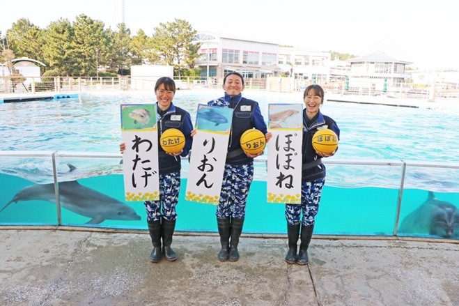 愛称が書かれたボールを、それぞれのお母さんイルカからお客さまにパスをして、受け取ったお客さまから発表していただきました。愛称発表会の様子は公式Instagramにアップしているのでぜひご覧ください。