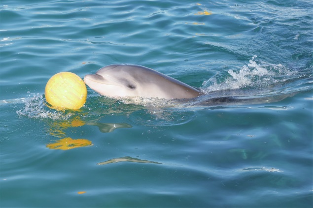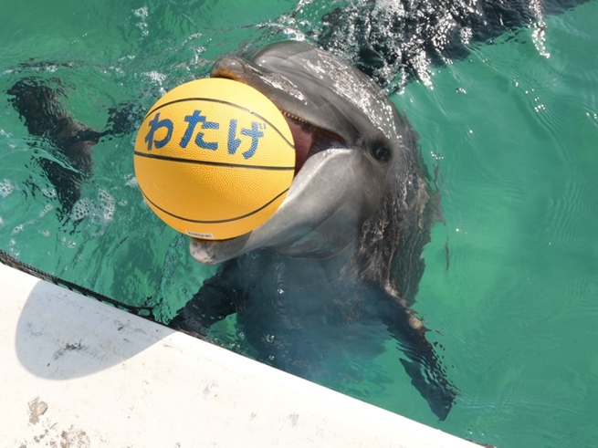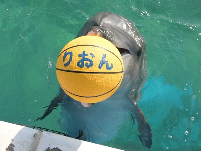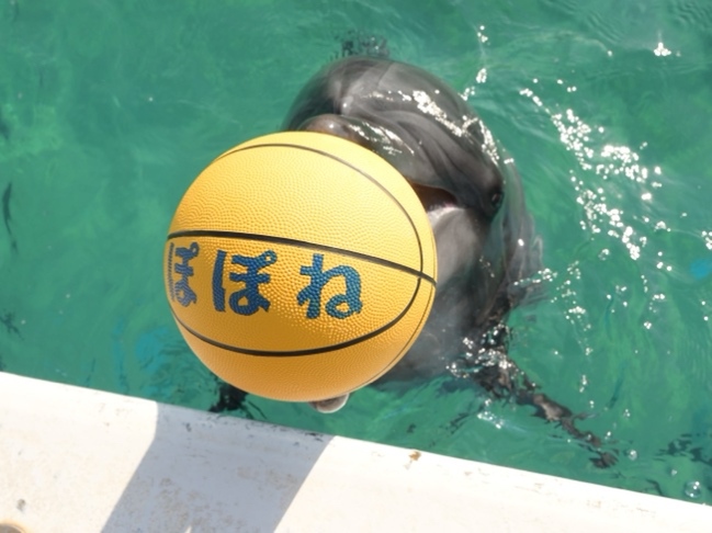 はじめはお母さんイルカの「ラビン」の横を泳いで見ているだけでしたが、少しずつ押したり触ったりとしている内に、ドリブルや水中深くまで沈めるなど大人イルカに負けないボールタッチを披露しています。