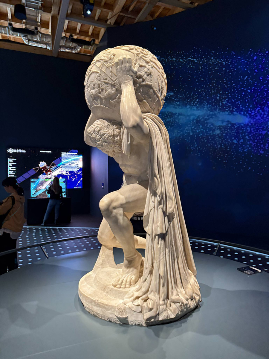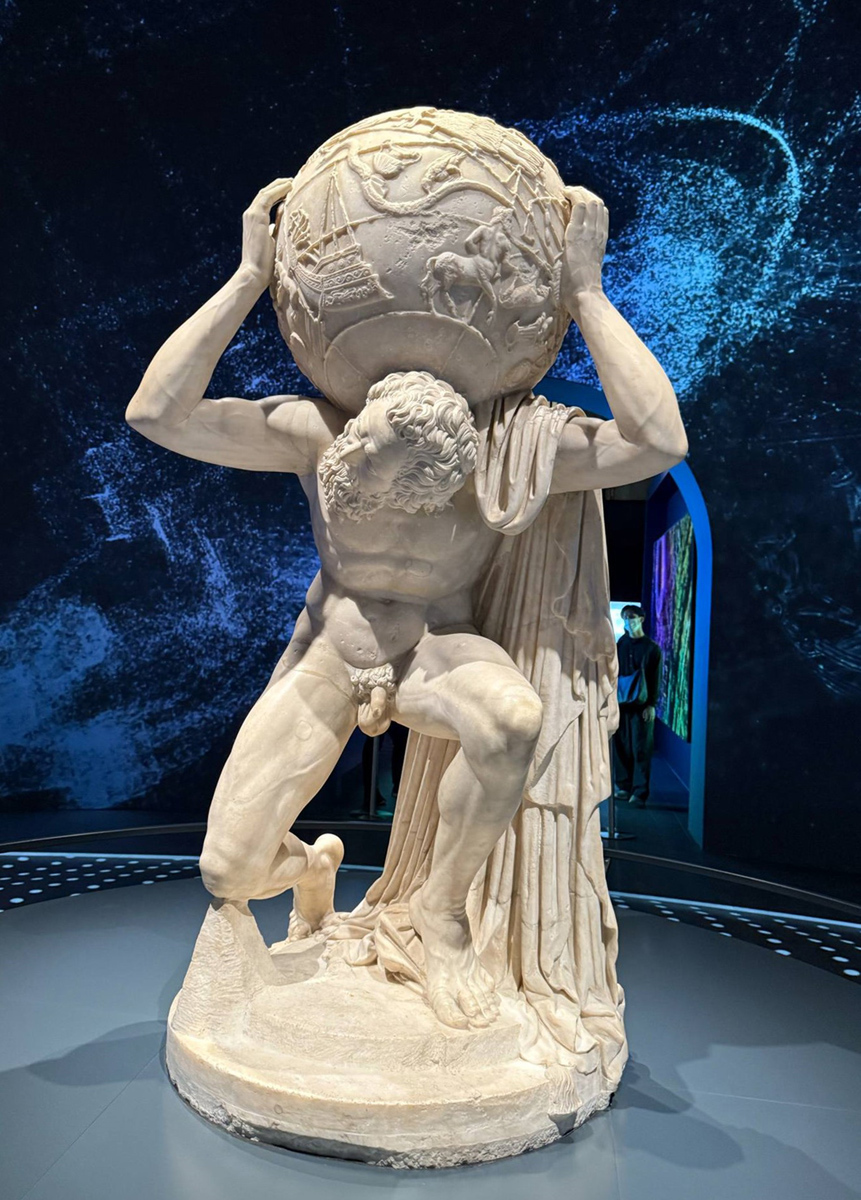 紀元2世紀の大理石彫刻。日本初公開であり、ナポリ国立考古学博物館の至宝。長いマントで覆われ、両手で肩の天球儀を持ち、猫背で膝を曲げたアトラスの姿が彫られている。ファルネーゼ・アトラスは、高さおよそ2メートル、重さ2トンもあり、科学的知識と巧みな芸術的技巧の融合を象徴している。