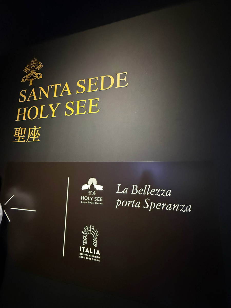パビリオンのロゴはサン・ピエトロ大聖堂と日本の太陽を融合し、キリストを「世界の光」として表現している。この空間は、再生と団結の世界共通言語として、芸術と信仰を称えている。万博の歴史の中で初めてのバチカンの公式出展である。