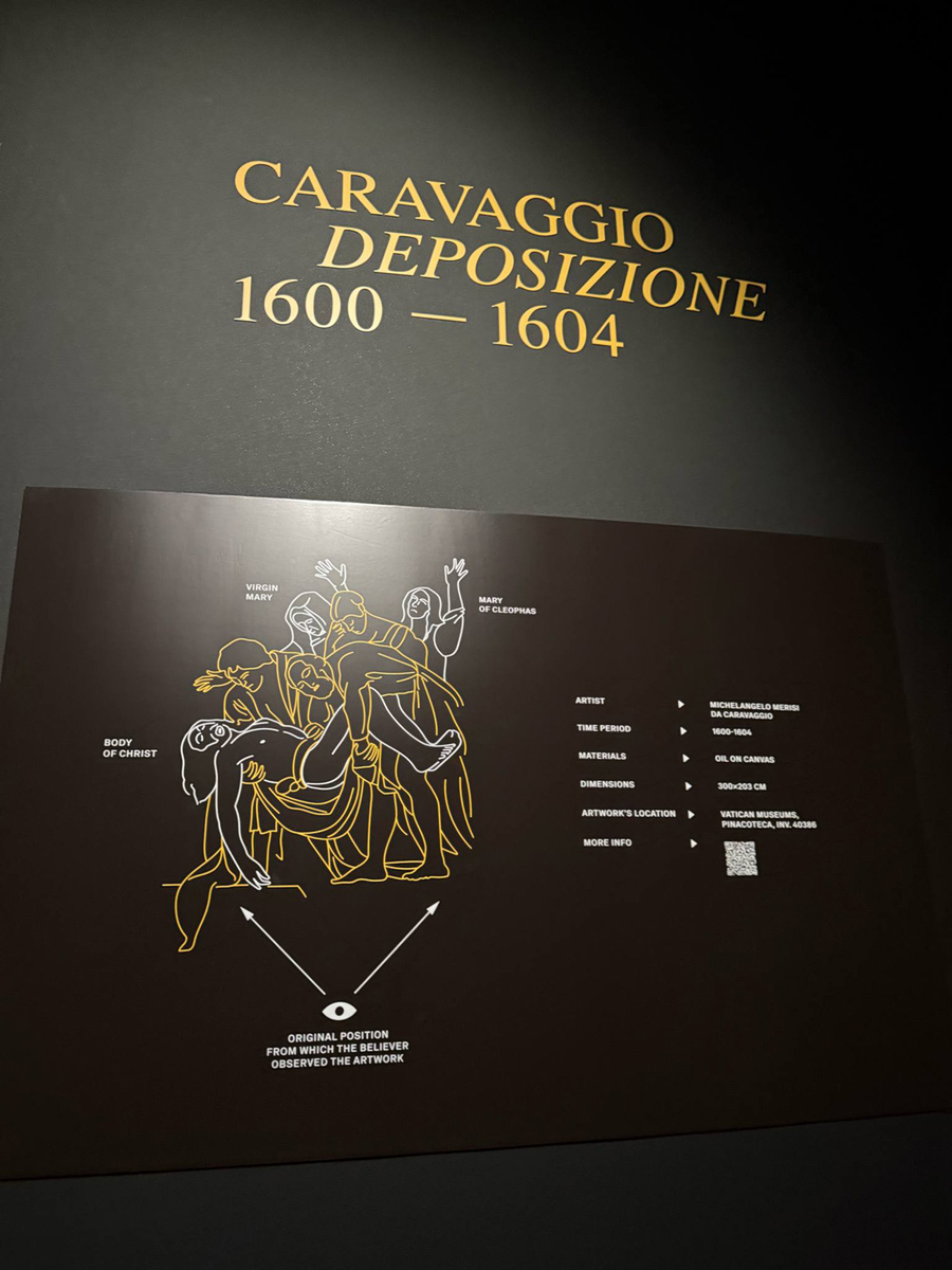 光が当たる部分(キリストの身体、顔)と影のコントラストで、奥行きと感情の強さを表現。光の方向が明確で、絵に立体感とドラマを生んでいる。特にキリストの肌の青白さ(死を象徴)と他の人物の温かみのある肌の対比が、死と生のコントラストを強調している。このエリアには、実際のサン・ピエトロ大聖堂の鐘の音が流れている。
