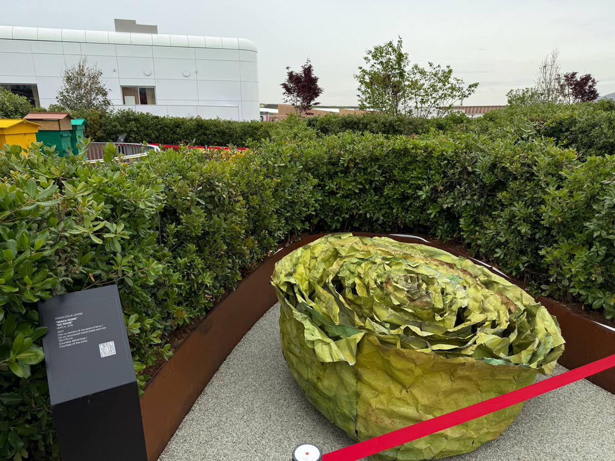 植栽の間にはフランチェスカ・レオーネ の『A rose, is a rose, is a rose』(2023年)を観られる。酸化され傷ついた金属板を使用した作品は、再生され、高貴になることにより、時間、芸術、環境の間の現代的な対話のメタファーとなっている。