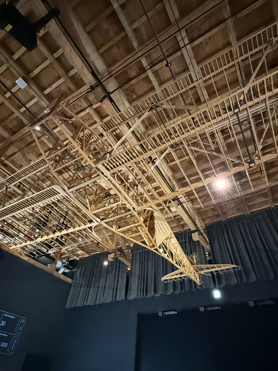 木製の骨組みをむき出しにした構造で展示するのは、2つの意味がある。1つは、この万博とイタリア館の中心テーマである持続可能な材料の使用。もう1つは、その時代を象徴する計器類を取り除いたこのレオナルド・ダ・ヴィンチ風の形態の並外れた工芸品は、時を超え、ルネサンス期とつながった神話となるというものだ。