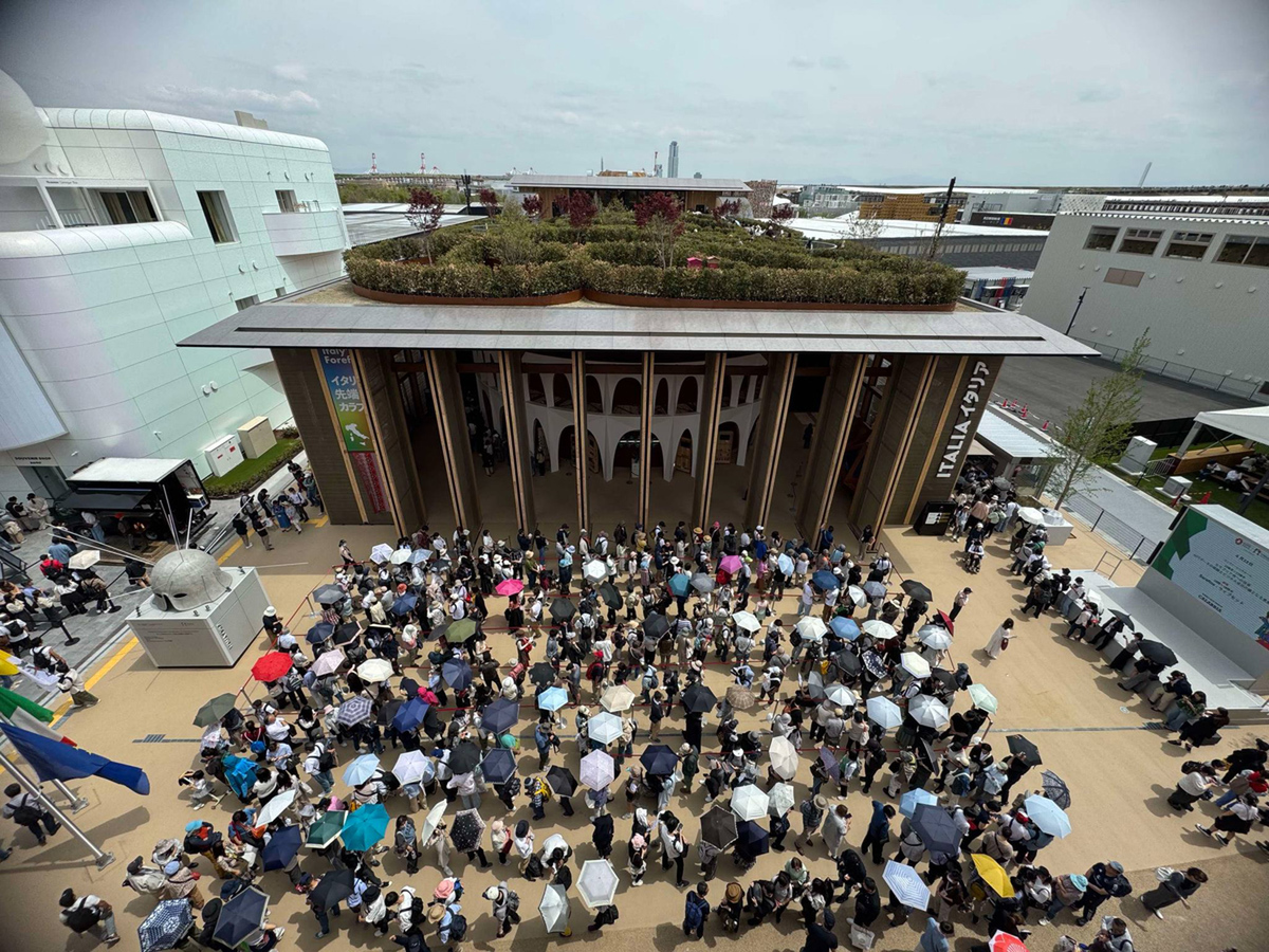 イタリアの伝統と最新技術を融合させ、ルネサンスの理想都市を現代的に再解釈したパビリオンは、建築家マリオ・クチネッラ、MCA(マリオ・クチネッラ・アーキテクツ)による設計で、木造3階建ての構造に「ピアッツァ(広場)」「テアトロ(劇場)」「ジャルディーノ(庭園)」が再現されている。