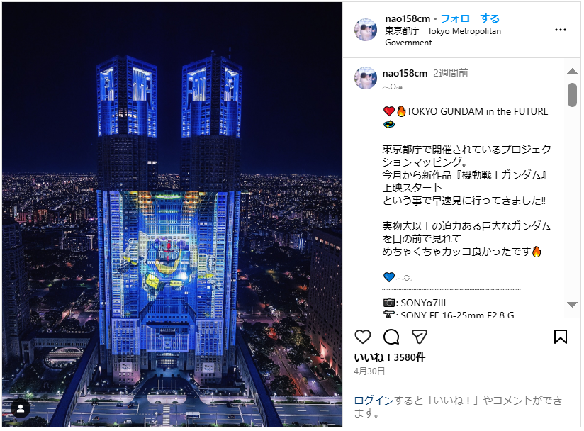 「東京都庁がホワイトベースとなりガンダムが宇宙へ発進する迫力のシーンを切り取りました。都庁を囲む新宿の夜景も宇宙空間のような雰囲気に。等身大以上の大きさで見れるプロジェクションマッピングでしたが鑑賞も撮影もすごく楽しめました。」