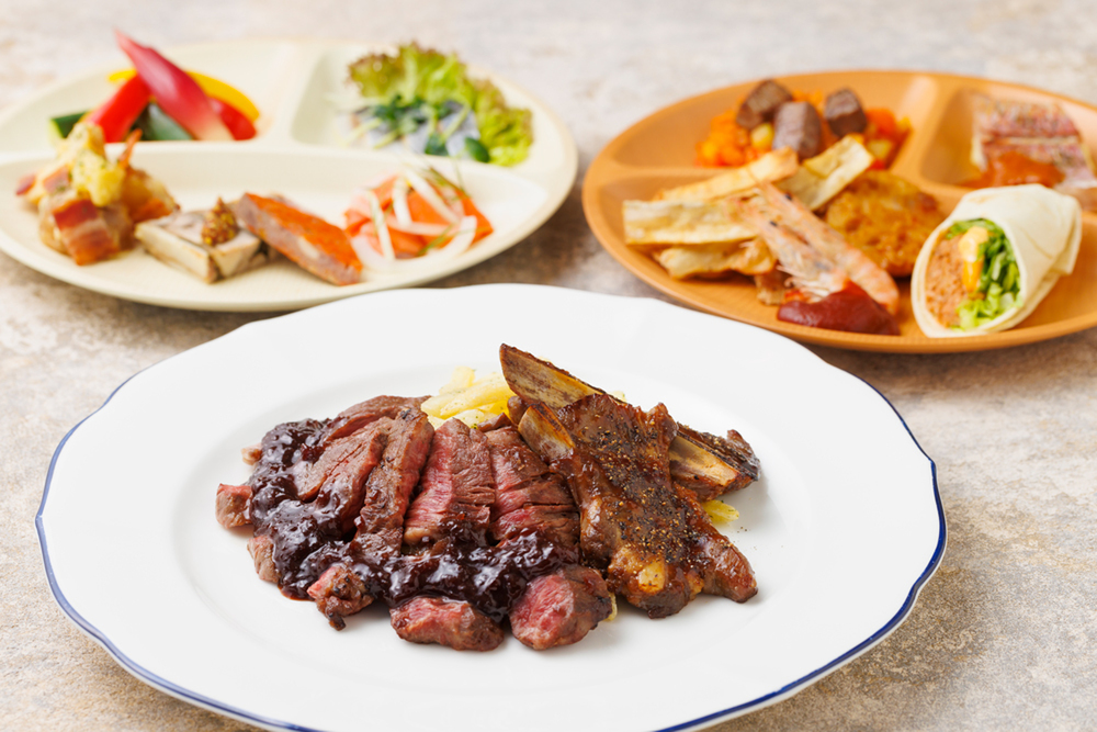 上質な国産牛ロースステーキと骨付きポークスペアリブの肉盛り合わせプレートが加わる贅沢なプランです。