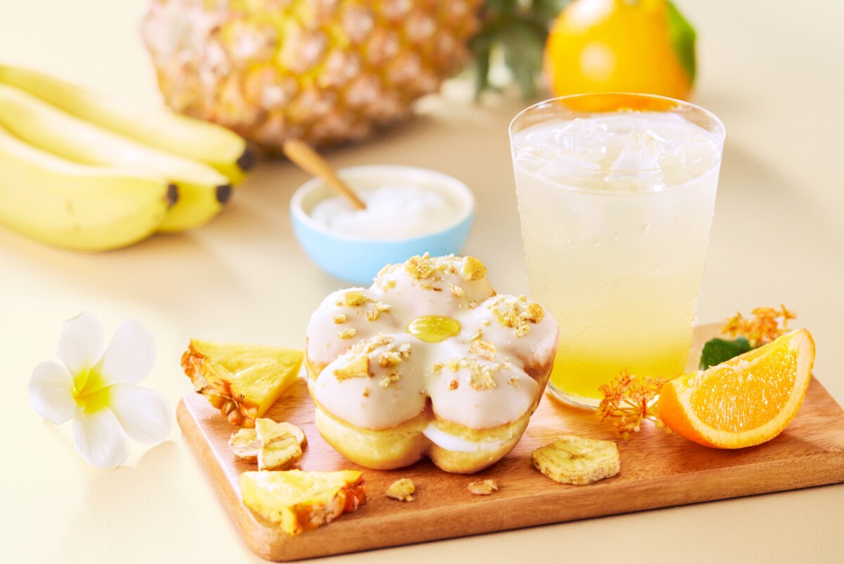 定番ドーナツ「オリジナル・グレーズド®」のイースト生地の端っこを集めて作ったエシカルなドーナツ。規格外パイナップルのソースに爽やかなヨーグルトクリームをサンドし、甘酸っぱさが夏らしい味わいです。トッピングした規格外のバナナチップが食感のアクセントに。