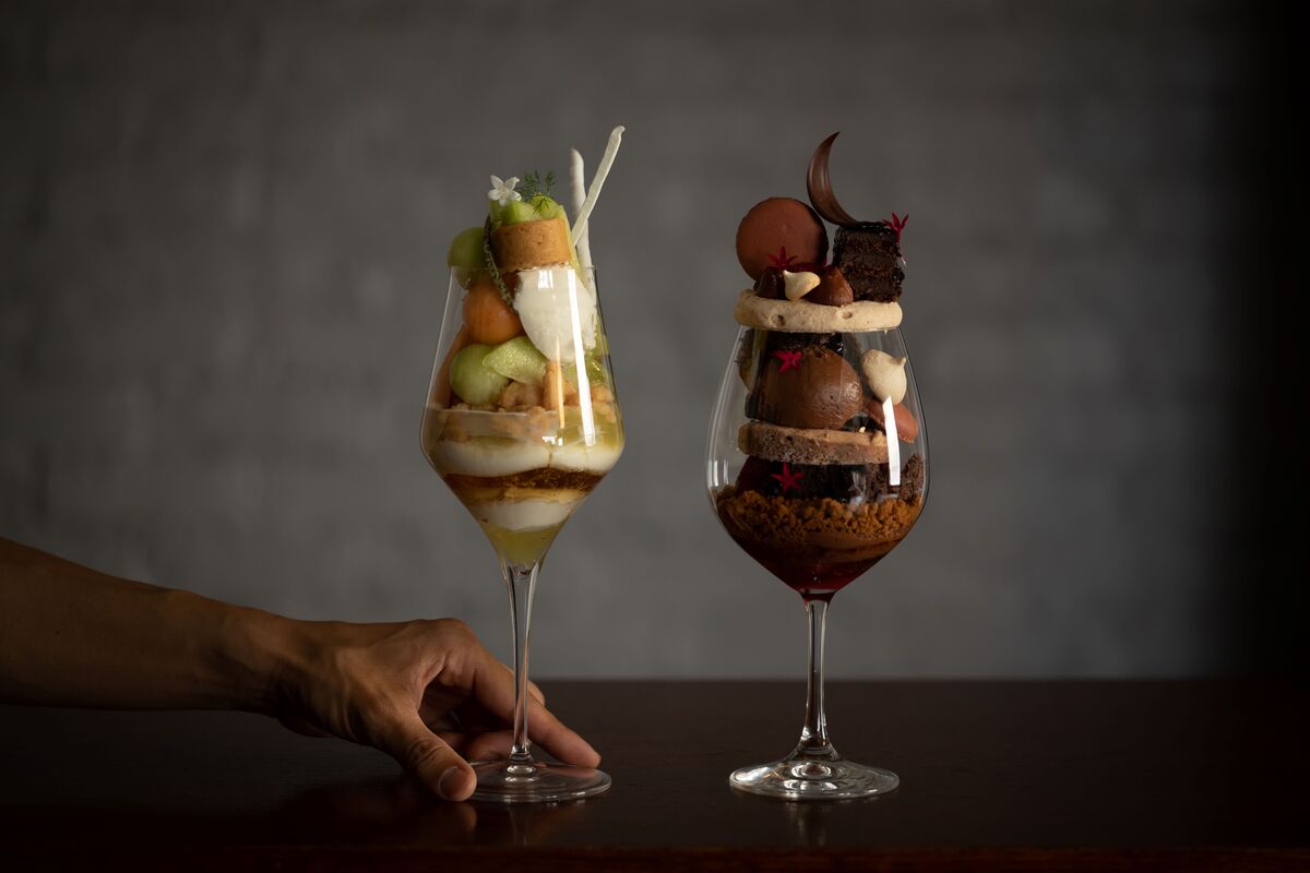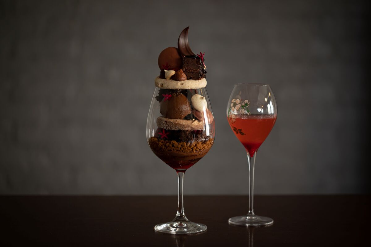 チョコレートケーキ、チョコレートアイス、メレンゲショコラ、フィアンティーヌショコラなどを重ねた「黒のパフェ」。マリアージュにはカクテル「キール・アンぺリアル」を。シャンパーニュをベースにフランボワーズを合わせたカクテルで、甘酸っぱくすっきりした味わいが、パフェのチョコレートと相性抜群。