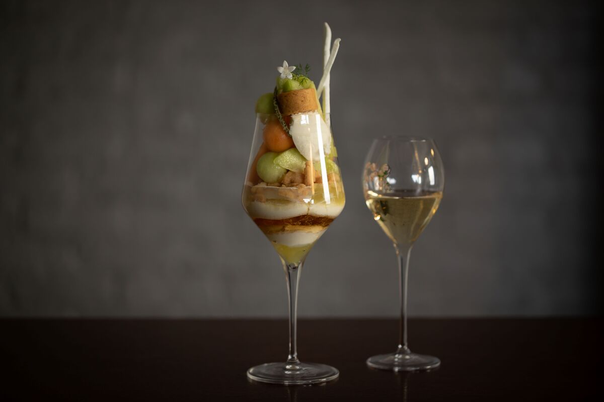 「白のパフェ」は旬のおいしさを重ね合わせた季節のパフェ。初夏の時期は生のメロンを使用し、メロンジュレ、シャルドネジュレを重ねて軽やかな風味が楽しめます。豊かなアロマが自慢のシャンパーニュ「ペリエ ジュエ グラン ブリュット」がぴったり。