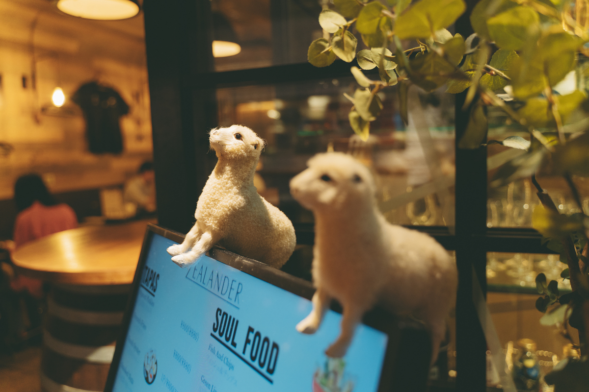 ワインボトルがずらりと並ぶガラス張りのファサードが目印。店内は木の温もりを感じるカジュアル空間で、壁には壮大なニュージーランドの風景写真や、国鳥・キウイのイラストが飾られています。羊のぬいぐるみもさりげなくいて、遊び心も満載!