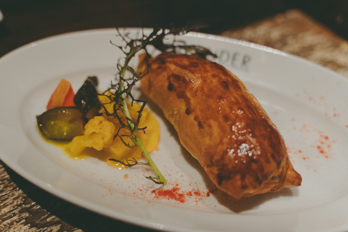 続いては「ラムのソーセージロール」。ソーセージと聞いていたけれど、出てきたのはパイ包みスタイル。ニュージーランドのパブでは定番の料理で、サクサクのパイ生地にラムひき肉がぎっしり詰まっています。ナイフを入れると溢れ出す肉汁が食欲をそそります。添えられた洋風ピクルスはイギリス発祥の「ピカリリ」というもので、ラムの旨みに爽やかな酸味と程よいスパイス感をプラスしてくれます。これはビールにもワインにも合う鉄板料理かも…! 美味しすぎてペロリと完食。笑