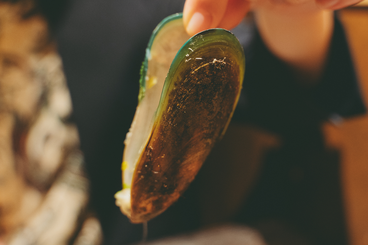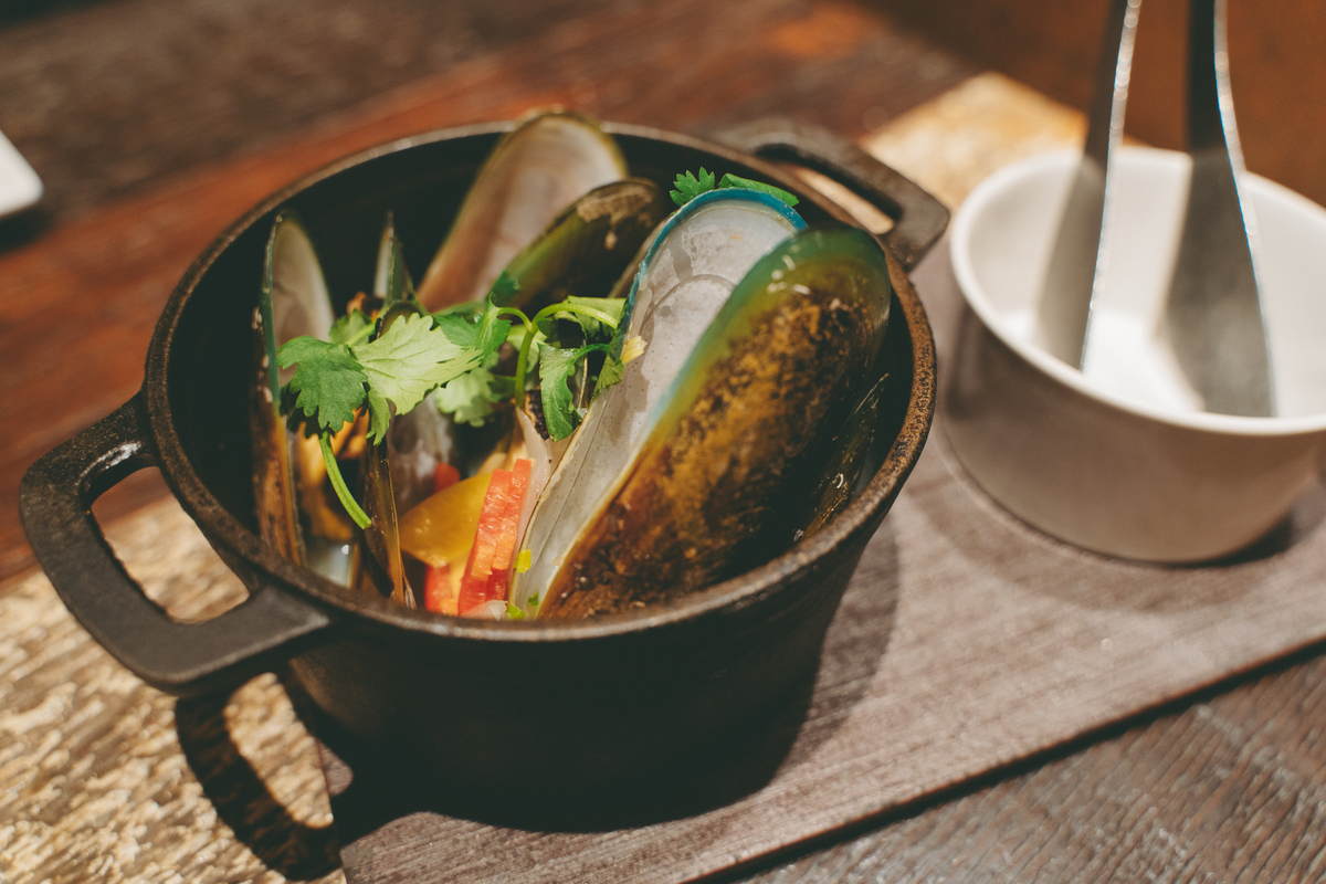 続いてオーダーしたのは「NZ産ムール貝の白ワイン蒸し」。大ぶりのニュージーランド産ムール貝が鍋に溢れそうなほど盛られています! ふわっと立ち上る白ワインと香味野菜の香りに、思わず深呼吸。一般的なムール貝よりも一回りサイズの大きな「グリーンリップド・マッスル」と呼ばれる貝は、その名の通り縁が緑色です。ぷりぷりの身は食べ応えもあって、白ワインとも相性抜群! 貝の出汁が溶け込んだスープはうまみたっぷりなので、フォカッチャと一緒にいただくのがおすすめです。