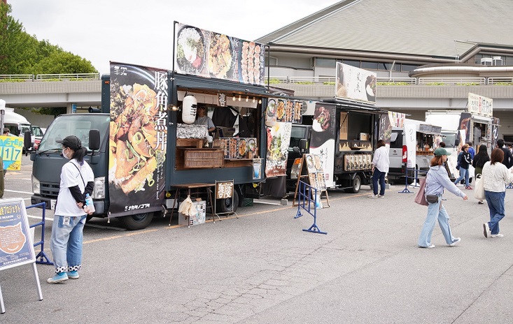 開場は13時、開演は15時で、それまでは場外で飲食を楽しむブースターたち。たくさんのキッチンカーが並び、その雰囲気はさながらグルメフェスのよう。するとサプライズで選手たちが登場。スタッフとして接客したり、セキュリティとして屋外を歩いたりして、ファンとの交流を楽しんだ。大好きな選手が間近で見られるとあって、スマホで撮影しながら歓声を上げるブースターたち。こうした仕掛けもファンフェスならでは。