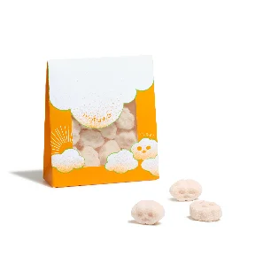 ピンク色のピーチソーダ味の「mofuwaプチ」。夏の熱い太陽をイメージしたオレンジ色の明るいパッケージの窓からのぞく姿もキュート。
