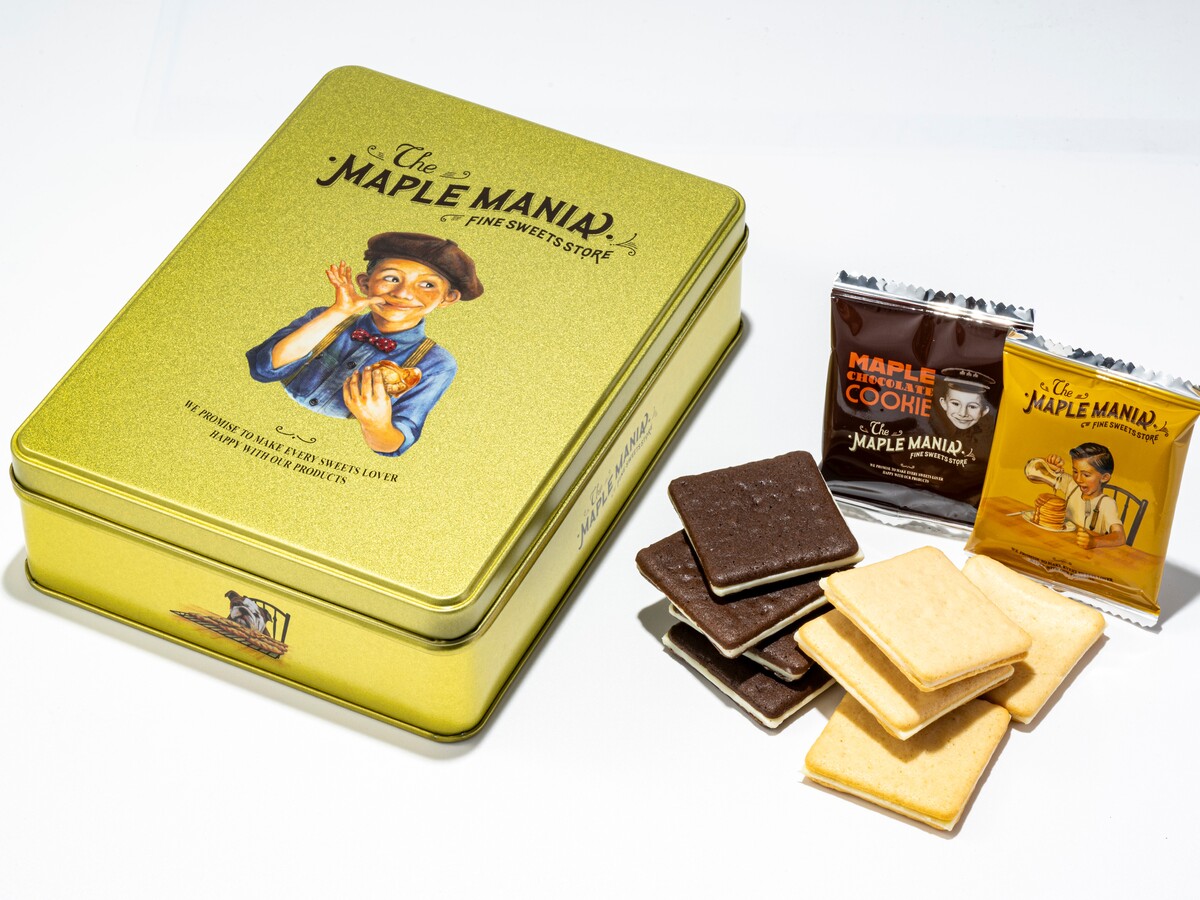 メープルバタークッキーとグランスタ限定商品のメープルショコラクッキーの詰め合せ。高級感あふれる金の缶に大きくブランドロゴをあしらったグランスタ限定缶入り。
