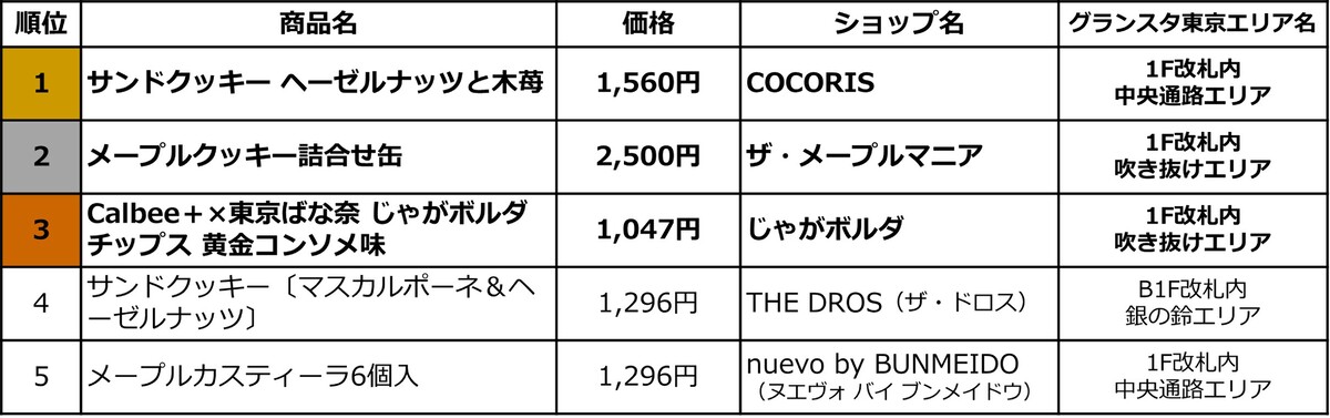グランスタ東京で販売する「東京駅限定手土産 売上ランキングベスト5」が発表されました。