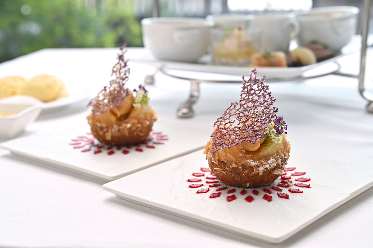そんな桃を贅沢に使い、赤すぐりとシャンパンを煮詰めて作った、少し大人の味わいをお楽しみいただける「桃のコンポート」や、あっさりとしたフロマージュクリームに包まれた「桃のクレームダンジュ」などのスイーツを楽しめるアフタヌーンティーです。