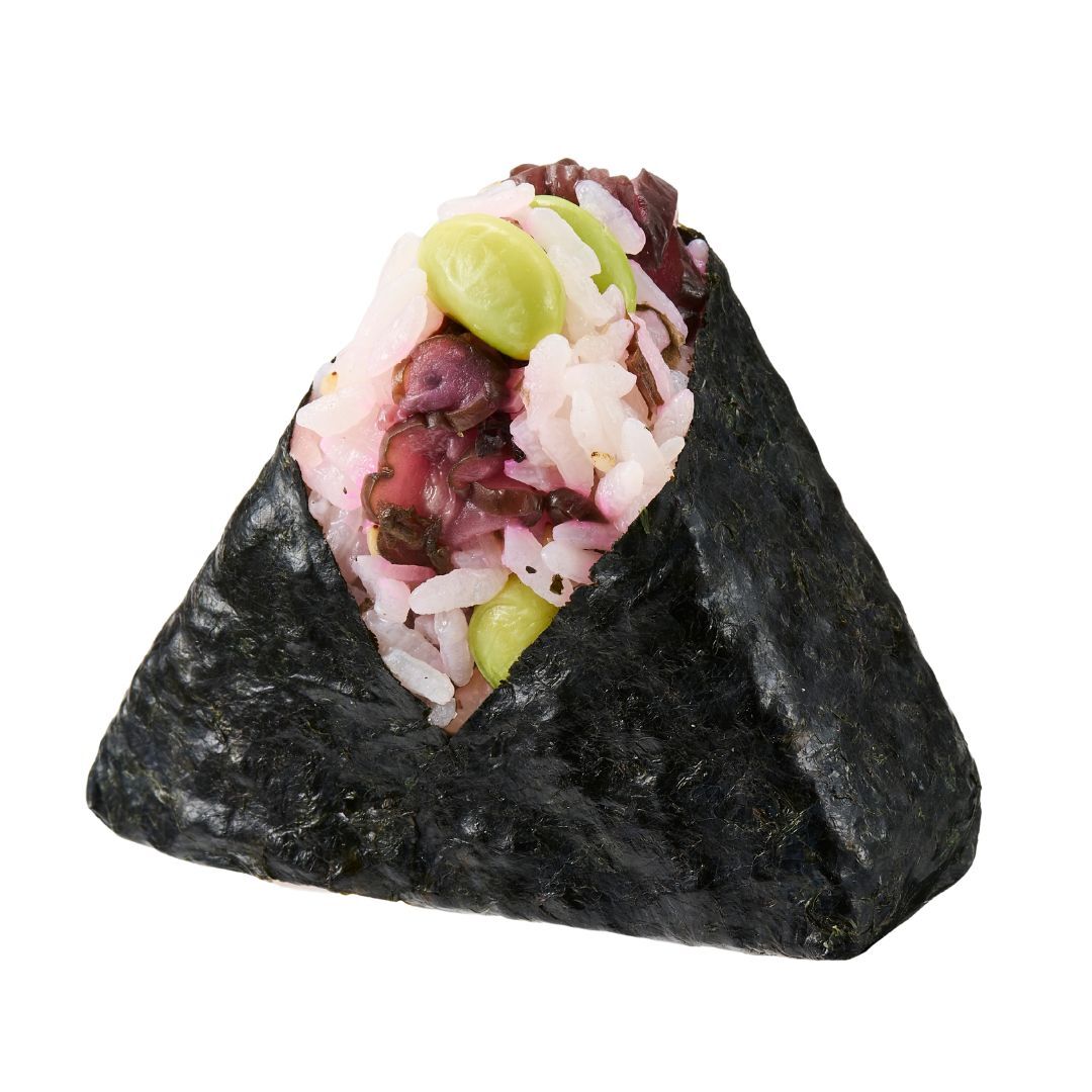 枝豆としば漬けを混ぜ込んだ夏らしい彩りの混ぜご飯をおむすびに仕立てました。爽やかな味わいが楽しめます。