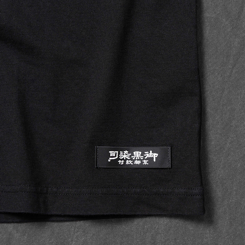 伝統的な正装である「黒紋付」だけを100年間染めてきた京都の染色工場「京都紋付」が持つ“深黒加工”に染め上げる技術を用いた、日本ならではの職人技が光るTシャツコレクション。 「京都紋付」ならではの“漆黒”に染め上げたのち、刷毛を使って職人による手作業で色を抜き、抜染する事により一点一点違う表情を表現しています。抗菌防臭機能と消臭機能を兼ね備えたマキシフレッシュを採用。