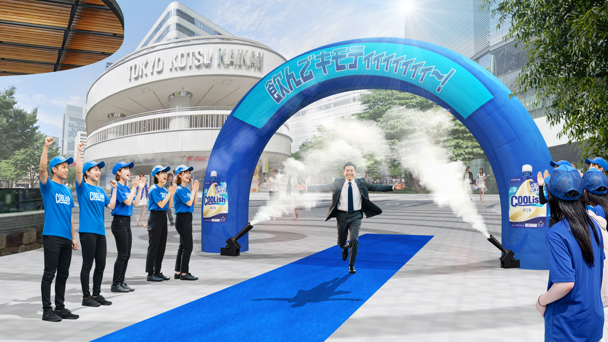 退勤ラッシュの熱帯夜、オフィス街に突如あらわれる高さ4.5 mの“ブルーゲート”をくぐれば、手渡されるのはキンキンに冷えた飲むアイス「クーリッシュ」──しかも無料!! まさに真夏の“ご褒美退勤”です。