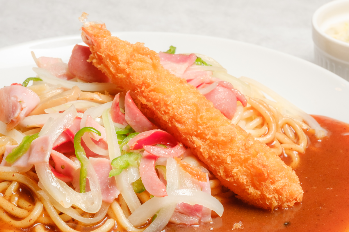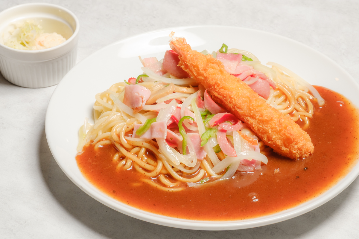あんかけスパゲッティは、初見では「これは本当にスパゲッティなのか?」と戸惑うほど独特です。とろりと重たく、コショウの刺激が効いた濃厚ソースが、太麺に絡みつく。
