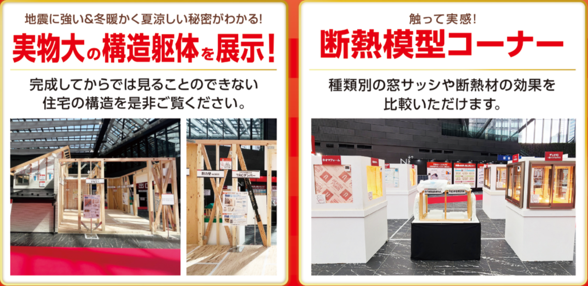 また、なかなか見ることのできない住宅の構造が見られるコーナーや、窓サッシや断熱材の違いを比べられるエリアなども設置。地震に強い家、寒さや暑さに強い家にリフォームするならぜひチェックしておきたい。