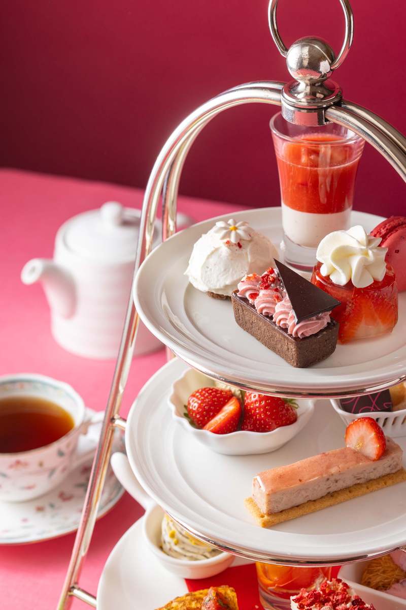 「いちごアフタヌーンティー」は、1・2段目にあるプチガトーの盛り合わせが特徴で、白ワインがいちごを引き立てる「いちごテリーヌ」や、いちごクリームをのせた「いちごとショコラのタルト」など、いちごをふんだんに使用したスイーツが揃っている。