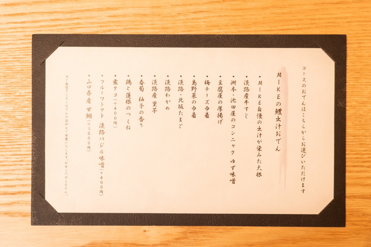おでんの具材は、定番の「MIKE自慢のだしが染みた大根」が人気。他にも肉厚な「淡路産牛すじ」、半熟たまごにトリュフのオイルがかかった「淡路・北坂たまご」も好評だそうです。面白いのは「フルーツトマト淡路バジル味噌」「梅チーズ巾着」など変わり種も豊富なこと。実はお店のメニューはフレンチのシェフが考えているそうで、淡路の農家の方から次の旬の野菜を聞いて、新メニューを編み出していると教えてくれました。