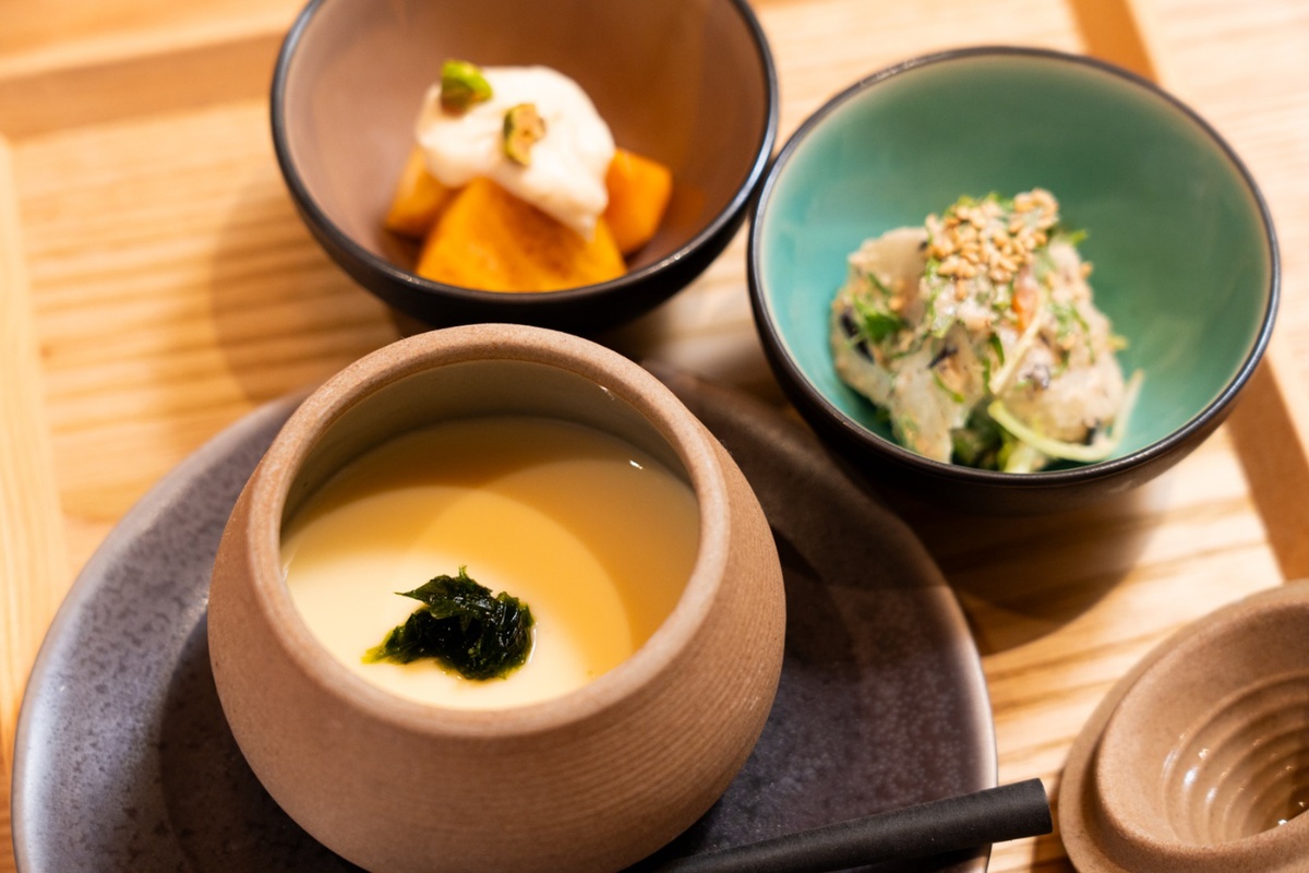 前菜のおばんざいは「くわいと水菜のごま和え」。水菜のみずみずしく弾力のある食感とごまの香りが鼻を抜けて、口に広がる優しい味に次への期待が膨らむおいしさでした。2つ目の「季節の果実の白和え」は、柿とピスタチオに白和えを乗せたもので、柿と白和えが生み出す少し甘めのテイストが、ピスタチオのコクのある味わいとマッチして絶品でした。