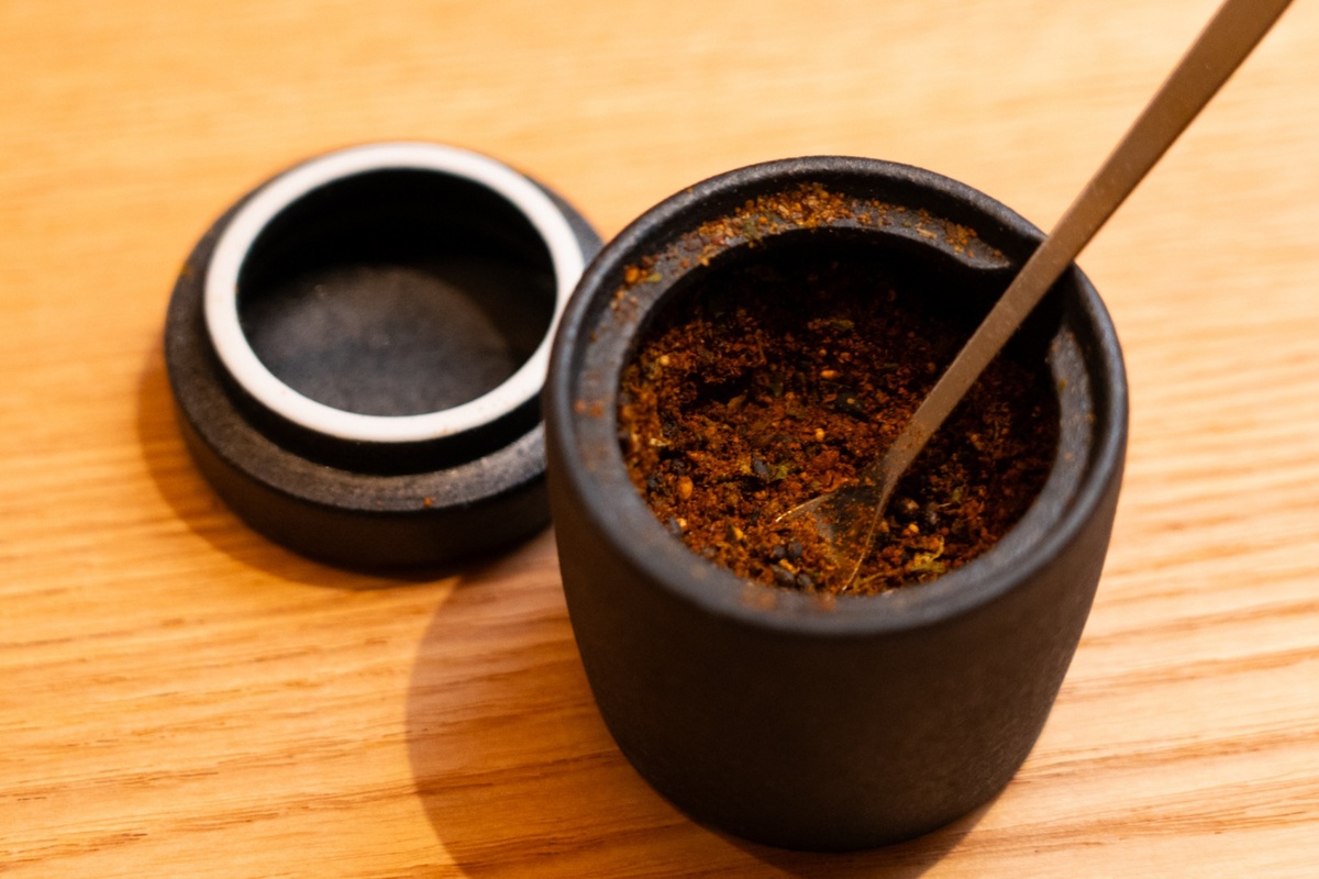 全体的に優しい味なので、飽きてしまった方は添えられている和辛子を使うとアクセントに最高です。他にも、各テーブルにお店オリジナルの黒七味があるので、それを少しかけるだけで香りとコクが加わるのでおすすめ。また、香物や赤だしを使った味噌汁は、お口直しになります。