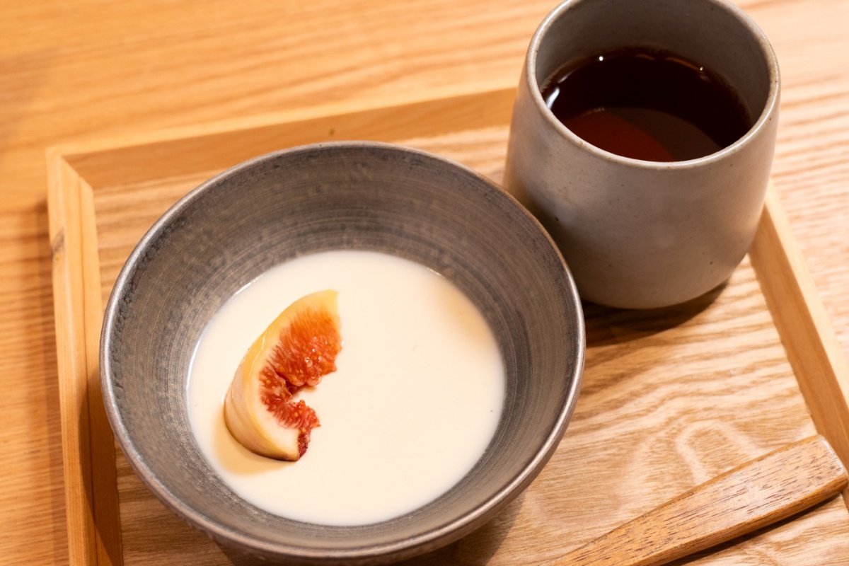 最後のデザートは「白ごまの豆乳プリン」。ごまのわずかな風味と、プリンの上に乗っているイチジクのつぶつぶとした食感が、あっさりと上品な甘味に奥行きを持たせていました。そして添えられたほうじ茶を口にすると、和食ならではの満足感に心が癒されます。