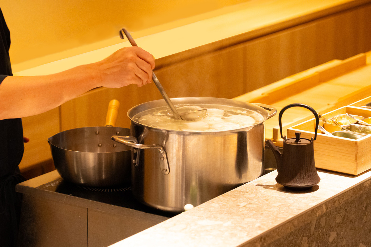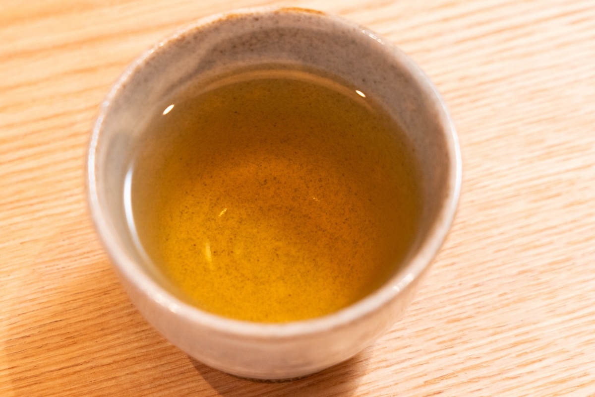 ここでメインとなるおでんが登場。最大の特徴であるおでんの汁は、ハモを使った魚介ベースと「おのころ雫塩」を使ったわずかな塩味が口に広がるまろやかさがあり、一口飲むと次も飲みたくなる、スープのような感覚の味わいでした。色も透明度が高くほんのり黄金色をしているので、濁りがなくとてもきれいです。
