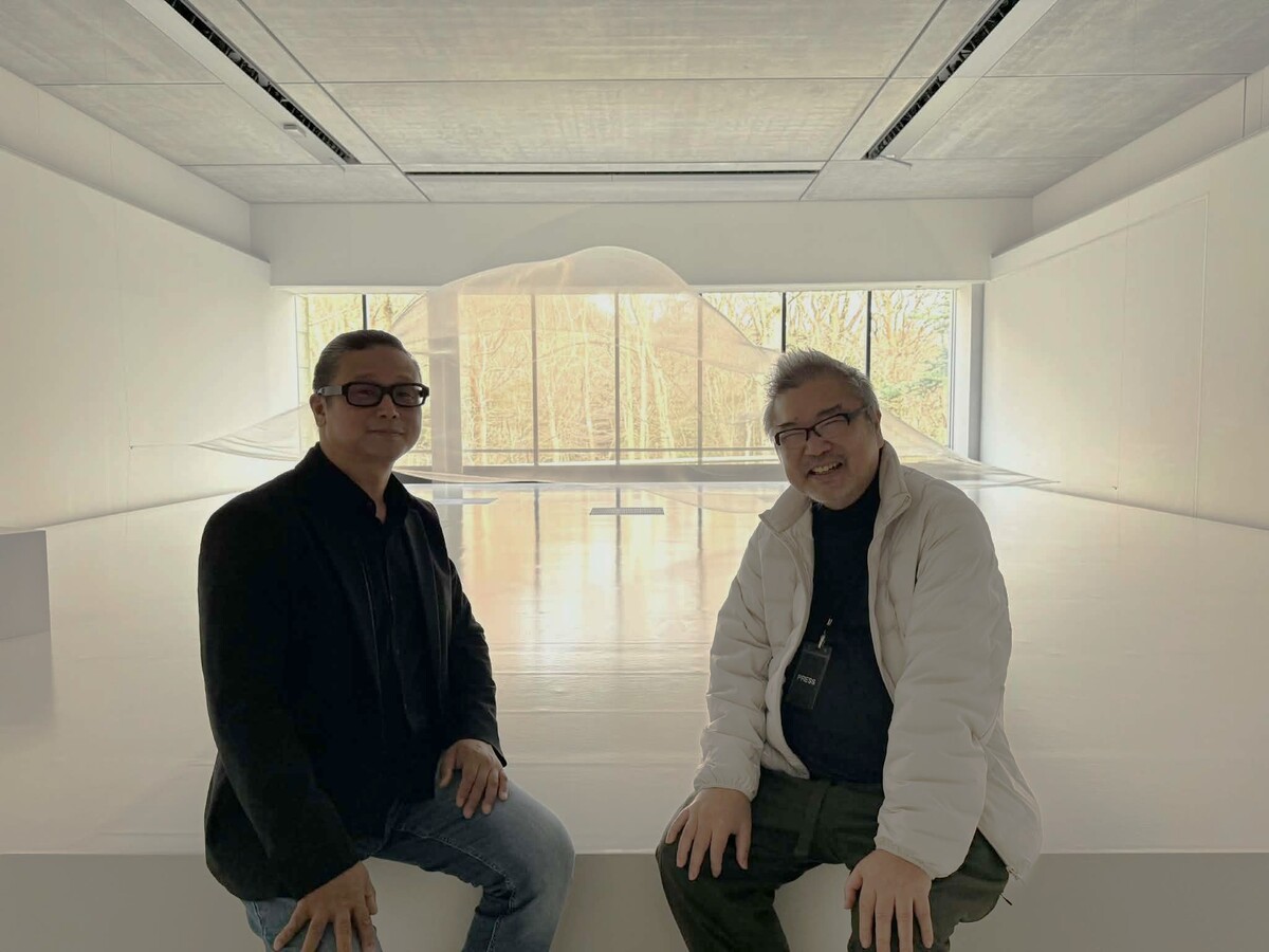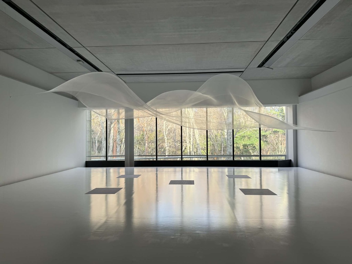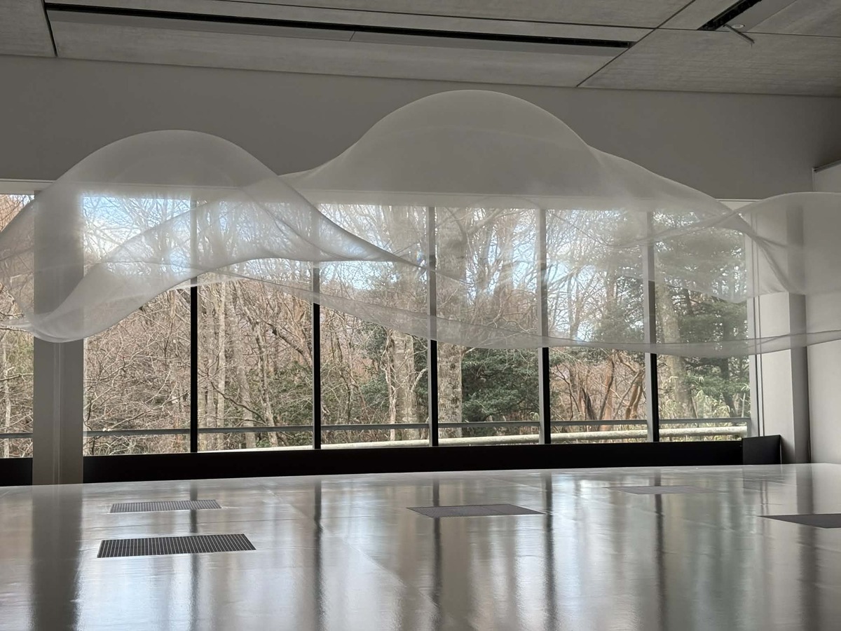 箱根という土地の力と共鳴しているのかもしれません。ぜひ、午後1時から3時あたりに見ていただきたいですね。 今日は雲がかかっているので全体的に淡い空間になっていますが、運良く日がグーッと差し込んでくると、布の物質感が一気に上がってくるんです。ここ数年、黒い布を使った作品を展開して、闇に消えていくような表現をしていたんですが、今回は原点回帰で『白い布』に戻しました。光と空気、そして箱根の自然との対話を、ぜひ楽しんでいただければと思います」