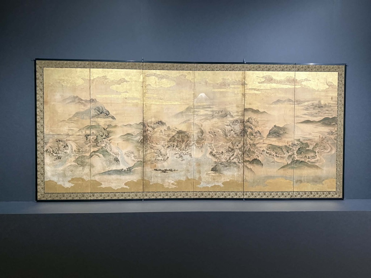 ≪東海道図屏風(右隻)≫(江戸時代中期。18世紀。紙本着彩6曲1双。箱根町立郷土資料館)。江戸と京都を結ぶ東海道の風景と地形を一対の屏風に表したうちの、右側の屏風(右)。右隻には、東は江戸城から西は現在の浜松市にある舞坂宿までが収められている。このような東海道図屏風は、武家などの有力者が所有していたもので、富士山をはじめ主要な山々や河川、海岸まで、東海道各地の地形と風景の特色が、宿駅をたどるように精密に描かれている