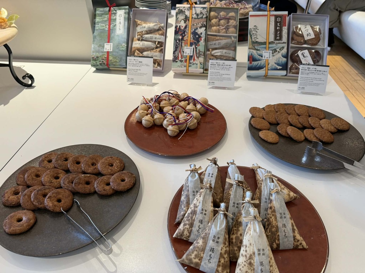 創業74 年を誇る箱根の老舗菓子店「ちもと」とのコラボレーション企画第3弾。ちもと「湯もち・八里」豊原国周《箱根七湯之内 塔之澤》 1,900円。ちもと「黒助・ゴマ助」歌川広重《富士三十六景 駿河薩夕之海上》 1,200円など。