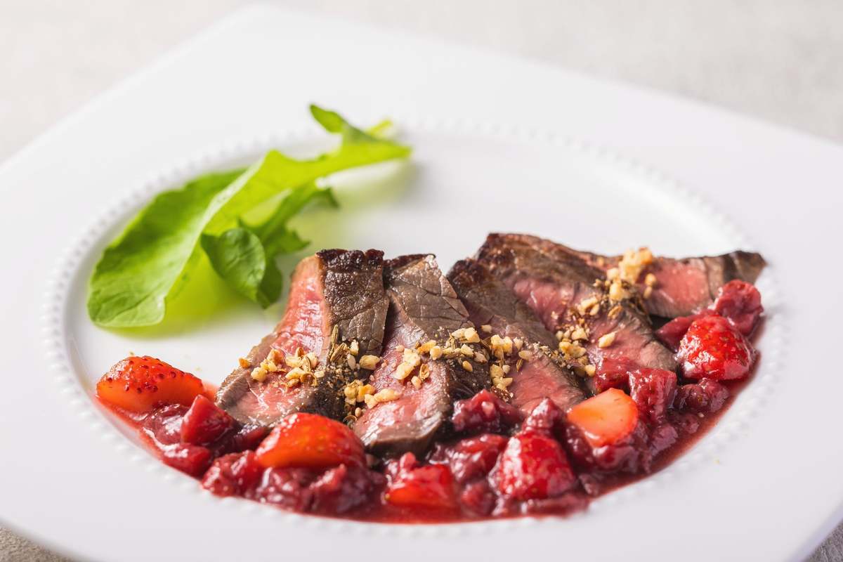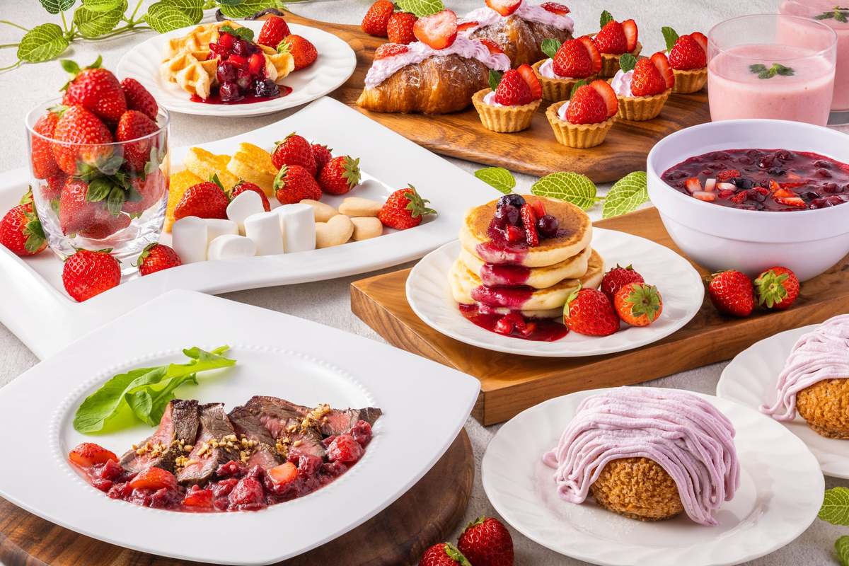 朝食ビュッフェでは規格外いちごを使用した「いちごスムージー」や、ライブキッチンで焼き上げる「いちごのクロワッサンサンド」を提供。夕食ビュッフェでは、地元ブランド牛の「むなかた牛」ステーキのソースにいちごを使用。赤ワインをベースにした甘酸っぱいいちごソースが、牛肉の旨みを引き立てる。