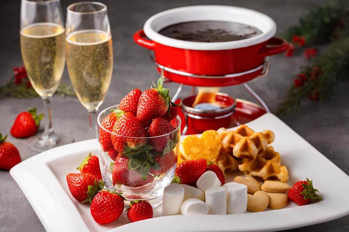 14時から楽しめる「いちごチョコフォンデュ×アーリーラウンジアクセス付」ステイプランでは、宗像いちごファームのスタッフが朝摘みしたあまおう・紅ほっぺの2種をチョコフォンデュで堪能。通常15:00から利用可能なラウンジを14:00から利用できるのでゆったり過ごせるところもうれしい。