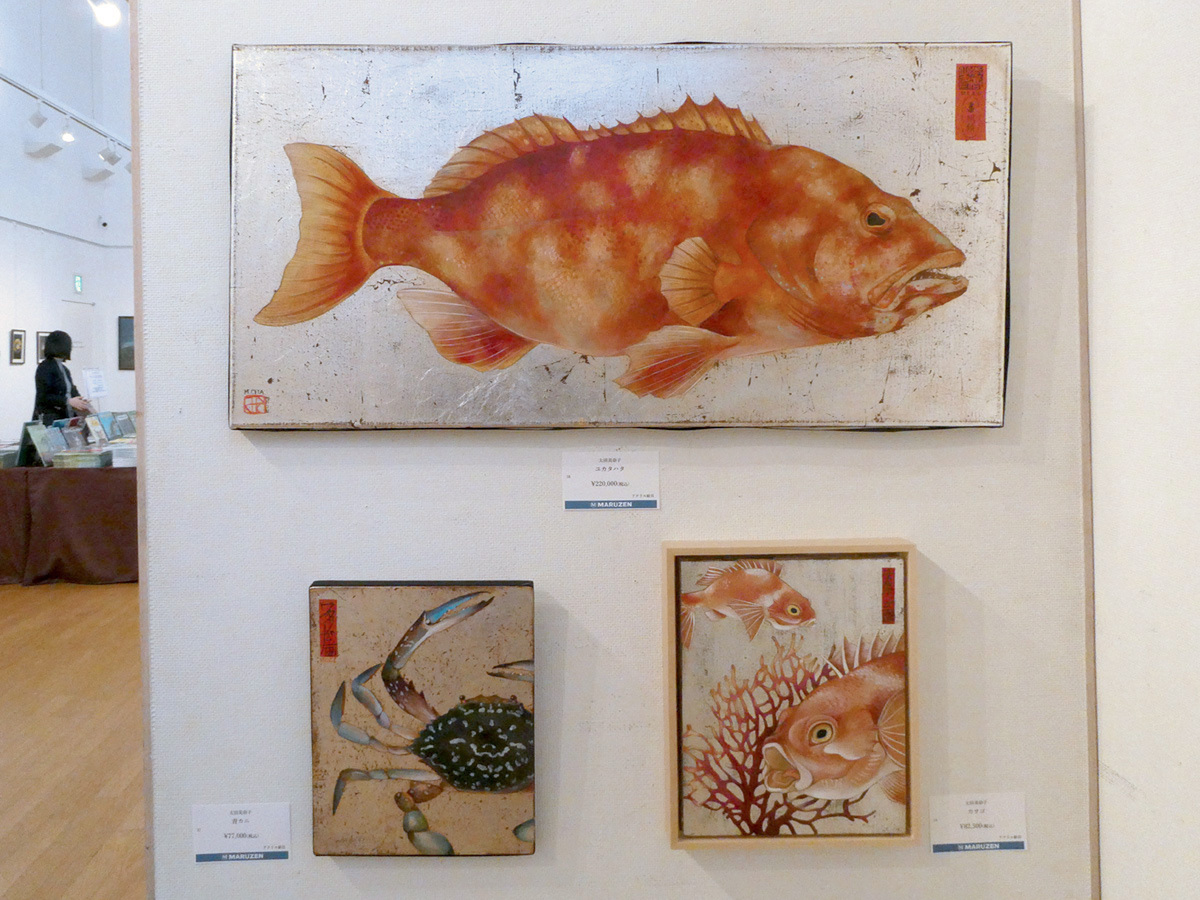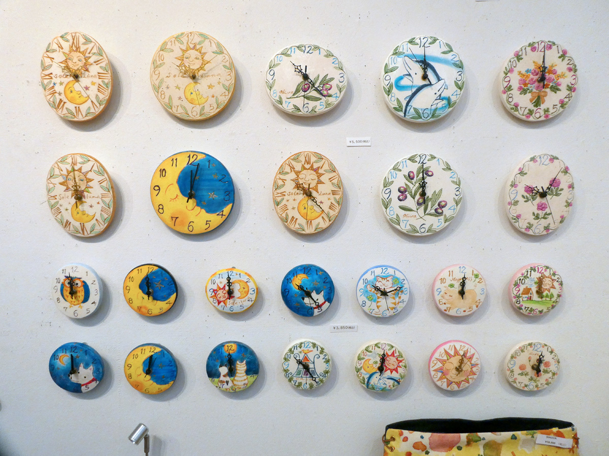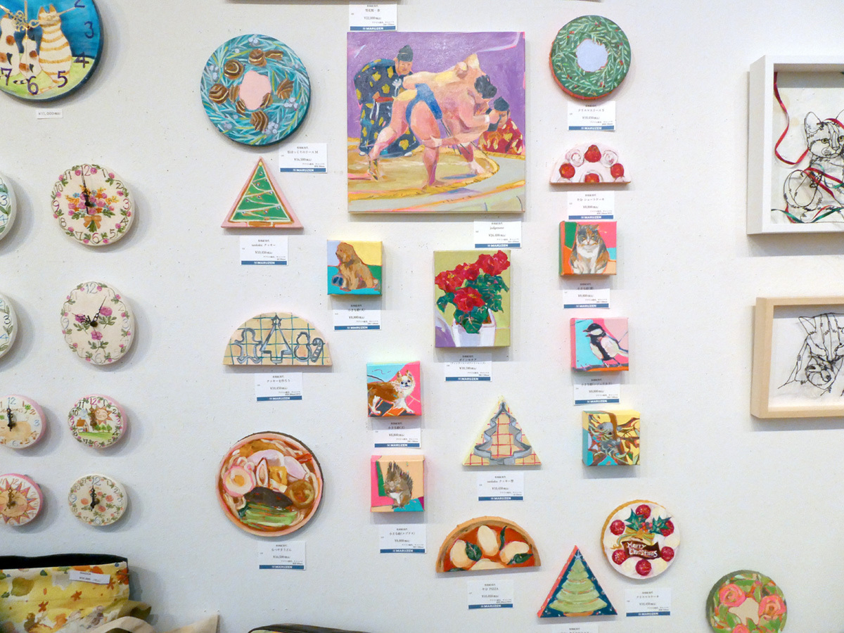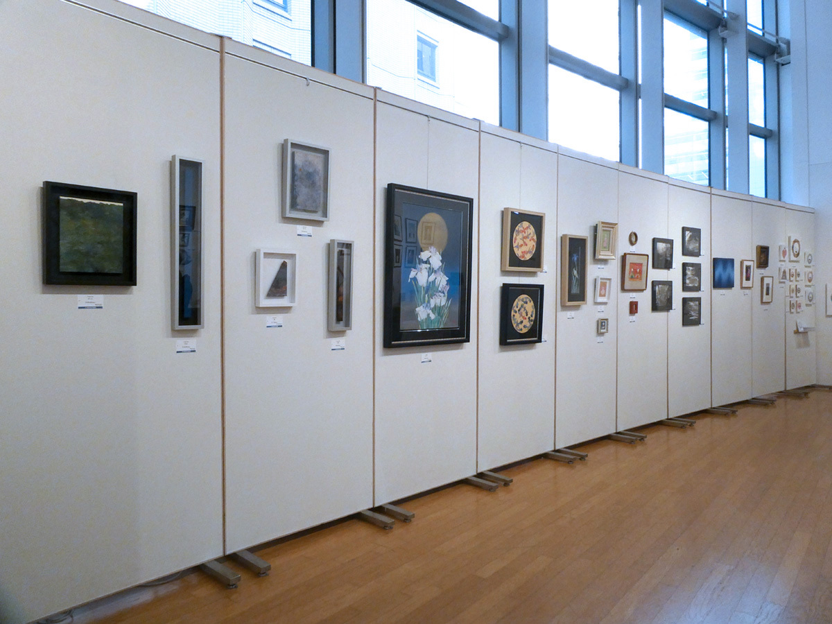 展示作品は油彩やアクリル画、版画などの絵画のほか、ジュエリー、クラフト、絵皿時計など多種多彩な作品が並んでいる。
