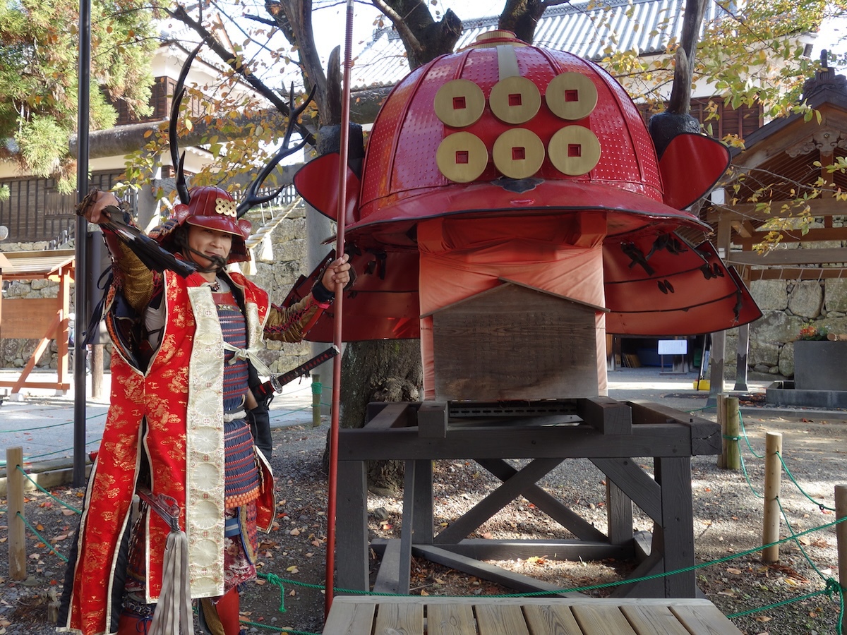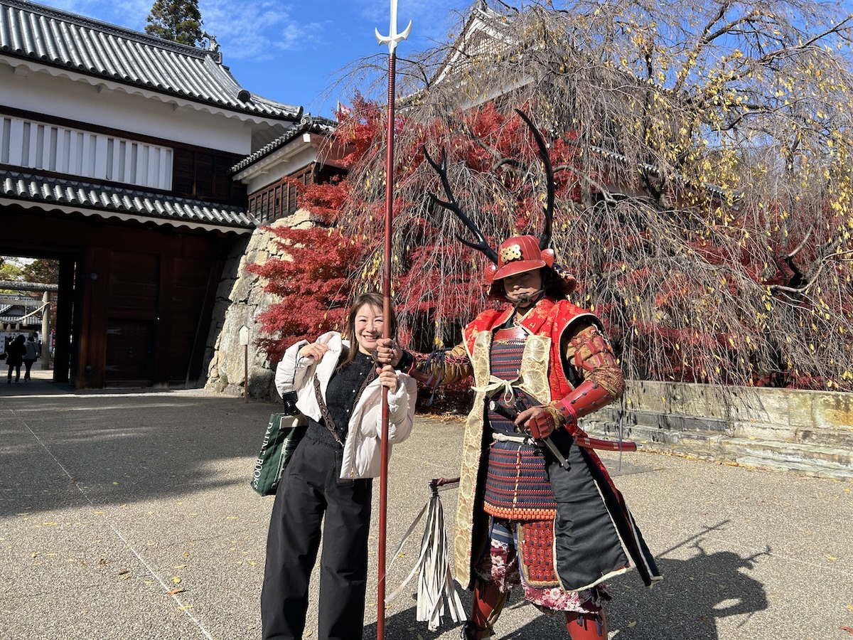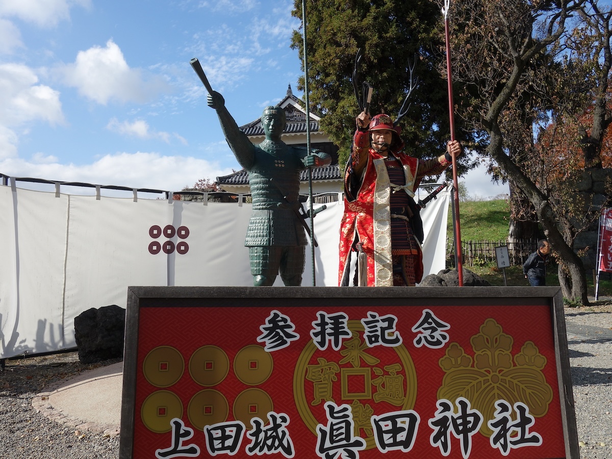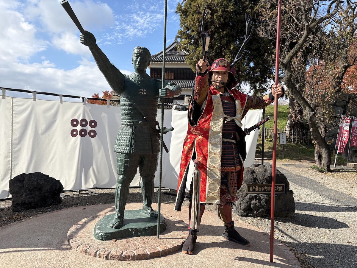 東虎口櫓門では「信州上田おもてなし武将隊 真田幸村と十勇士」の真田幸村さんと猿飛佐助さんが迎えてくれました。上田城の魅力と城下町をPRするため2012年に結成された、歌って踊れるガイドとのこと。記念写真にも気軽に応じてくれます。