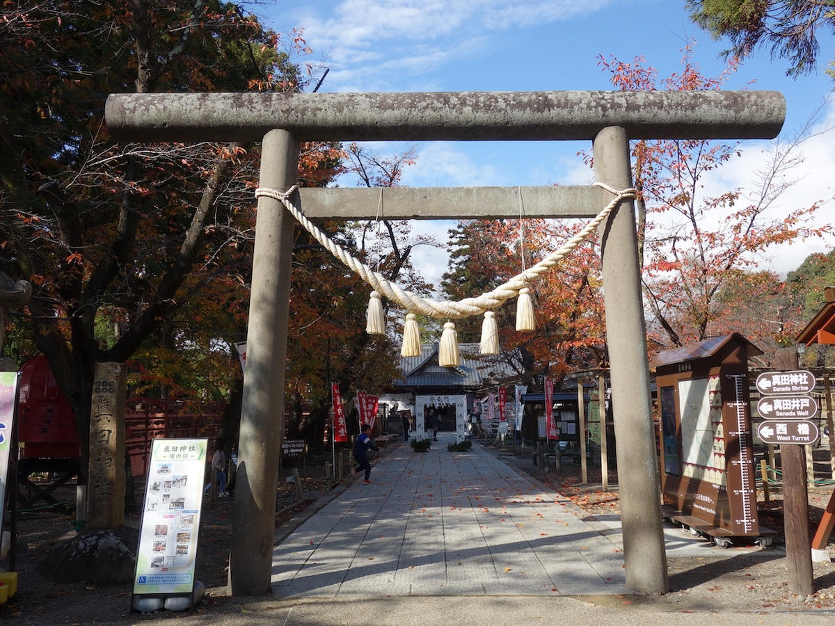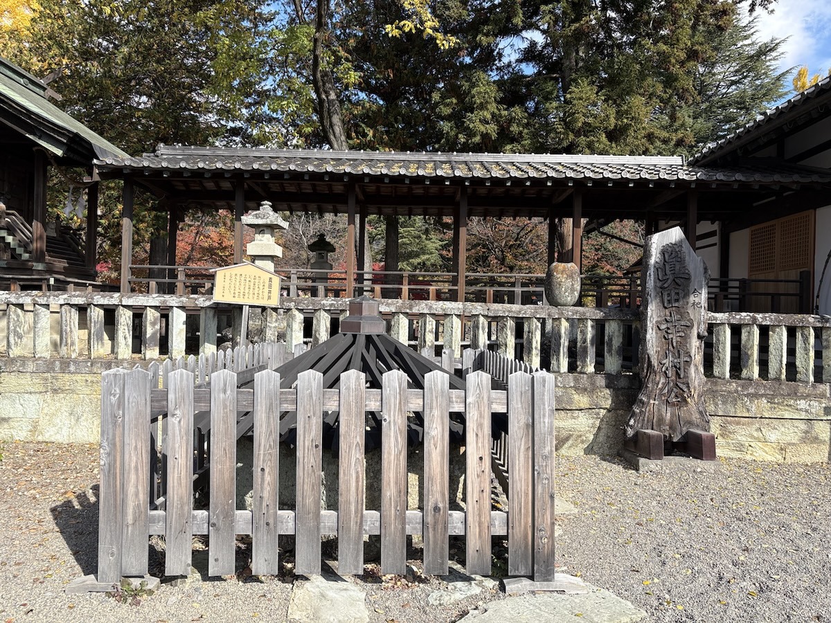 眞田神社の左奥には、16歳の若き真田幸村公の銅像が建っています。なんとこの銅像のモデルは、「おもてなし武将隊」の真田幸村さんだそうです(本人談)。以前の紅葉まつりのときに撮った真田幸村さんの写真を真似て作られたのだとか。