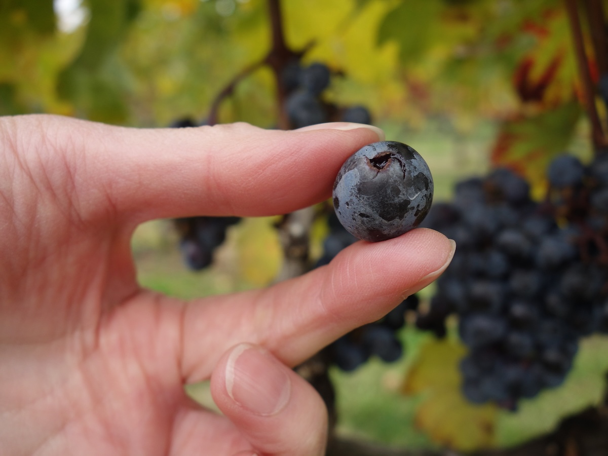 ツアー参加者は特別にワイン用のぶどうを味見できます。ワイン用のぶどうって初めて食べたのですが、甘くてびっくりしました。一般の食用ぶどうの糖度が16度程度であるのに対し、椀子ワイナリーのワイン用ぶどうは糖度が20度を超えるのだそうです。アルコール発酵には糖分が必要なんだとか。