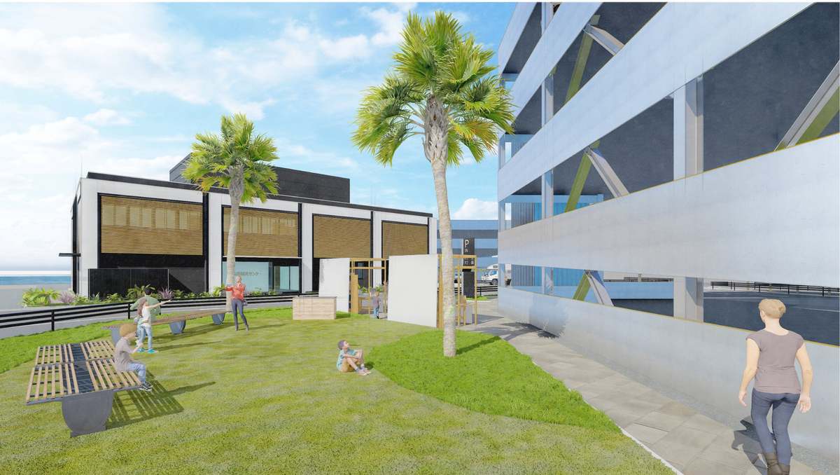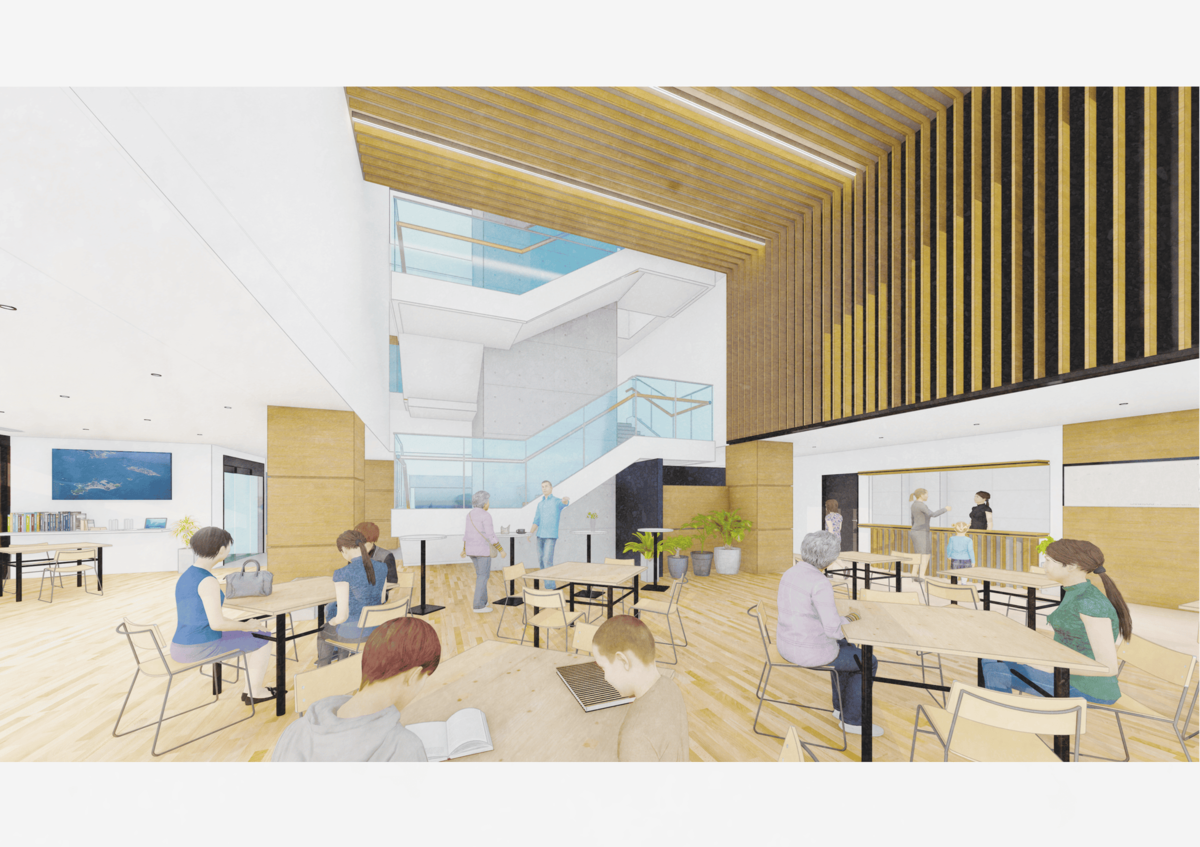 新しい師崎港観光センターのポイントは、船の待合所としての機能だけでなく、滞在そのものが楽しめる空間に生まれ変わった点。施設内には、船待ちの時間だけでなく日常的に利用できる明るく広々とした待合・交流空間が設けられているほか、太平洋や両離島を一望できる展望広場も整備され、憩いの場を提供する。