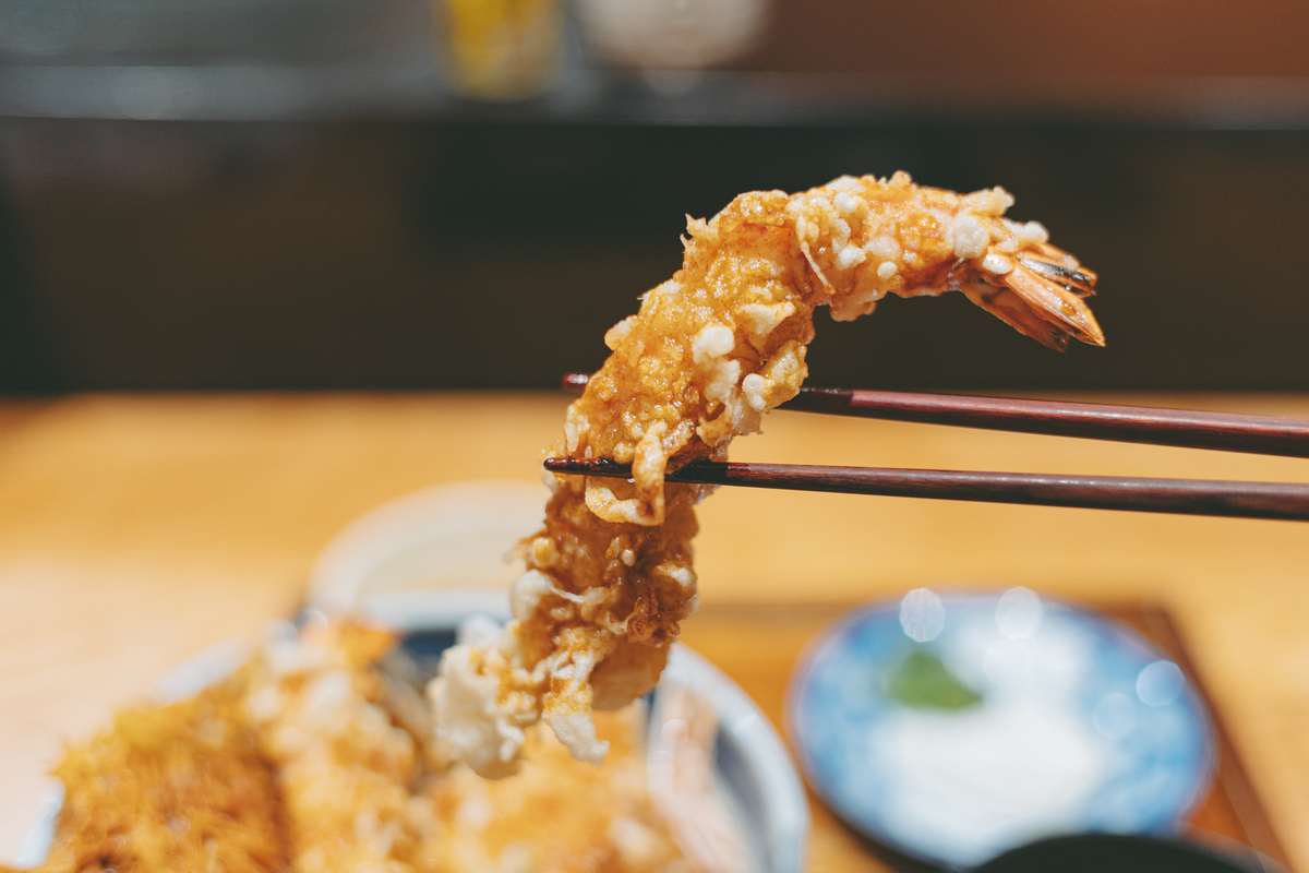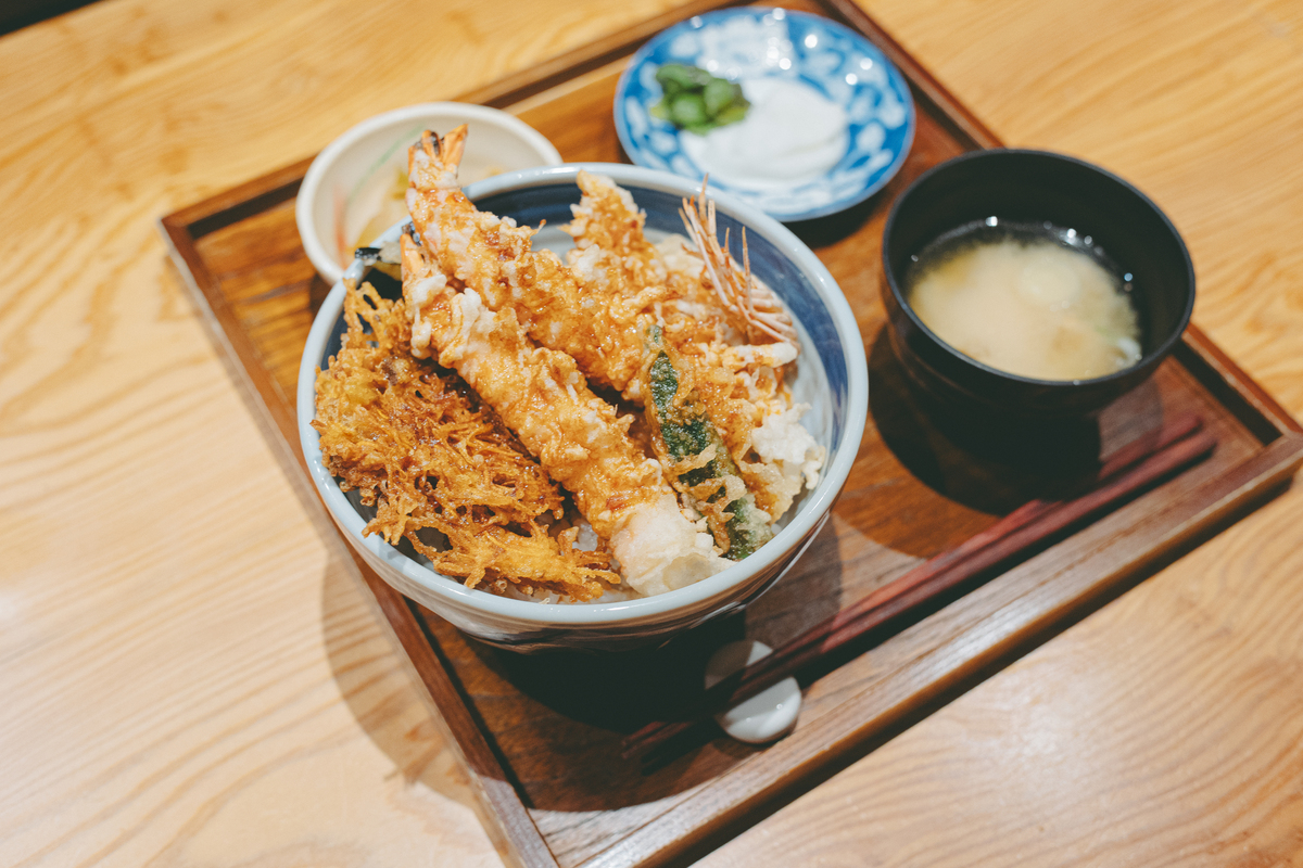 ランチタイムのお目当ては海老天丼。ミシュラン獲得店監修の技を受け継ぎながらも、ランチは気軽に注文できる価格設定で、平日でもすぐ満席になる人気ぶりです。海老が4本入った「特上海老天丼」や、7本も入る「海老SEVEN天丼」など、本数違いのバリエーションもあり、特に「海老SEVEN天丼」は外国人観光客にも大人気。とはいえ、満足感とコスパのバランスを考えると、オリジナルの海老天丼でも十分すぎるほど――ということで、今回は「海老天丼(1,980円)」をオーダーしました。