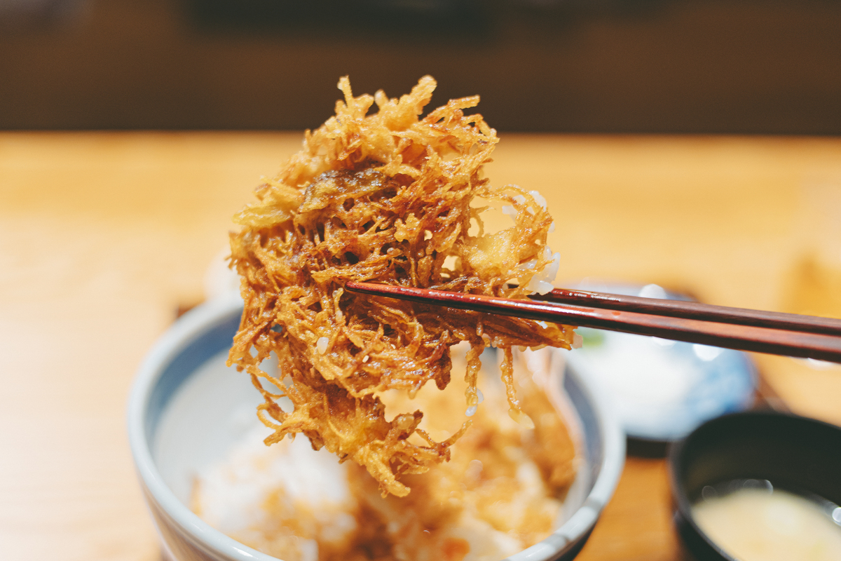 目の前で揚がる音と香りに期待を膨らませながら待つこと約10分。運ばれてきたのは、どんぶりから溢れんばかりに天ぷらがぎっしりと盛られた一杯。ご飯がほとんど見えないインパクト大なビジュアルに、思わず「うわ…!」と声が漏れます。主役は、大ぶりなブラックタイガー海老。約200度の高温で一気に揚げられた衣は、外は軽やかにサクッ、中はプリッと弾けるような食感。衣は驚くほど軽く、素材の旨みを邪魔しません。サクサクに揚がった海老頭まで美味しいのも、天ぷら好きにはたまらないポイントです。