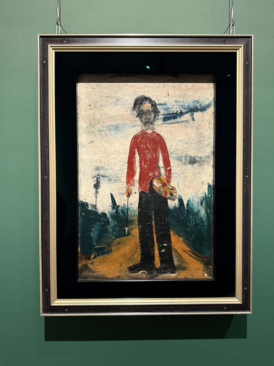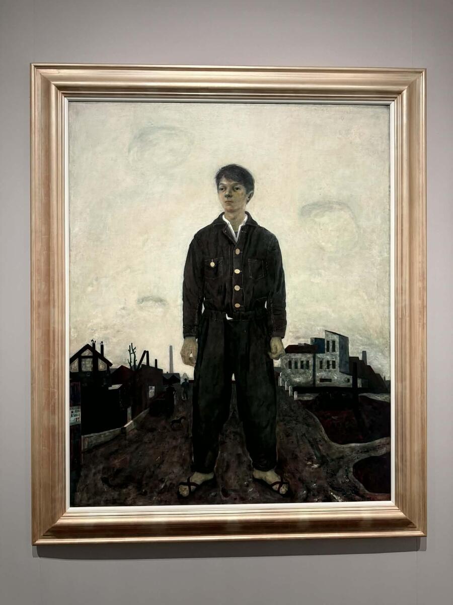 松本竣介《立てる像》(1942年、油彩/カンヴァス)。神奈川県立近代美術館所蔵©上野則宏。第29回二科展出品作品。竣介が描いた自画像の中で、最大級のもの。描かれた舞台は新宿である。背景に広がるのはごみ捨て場である