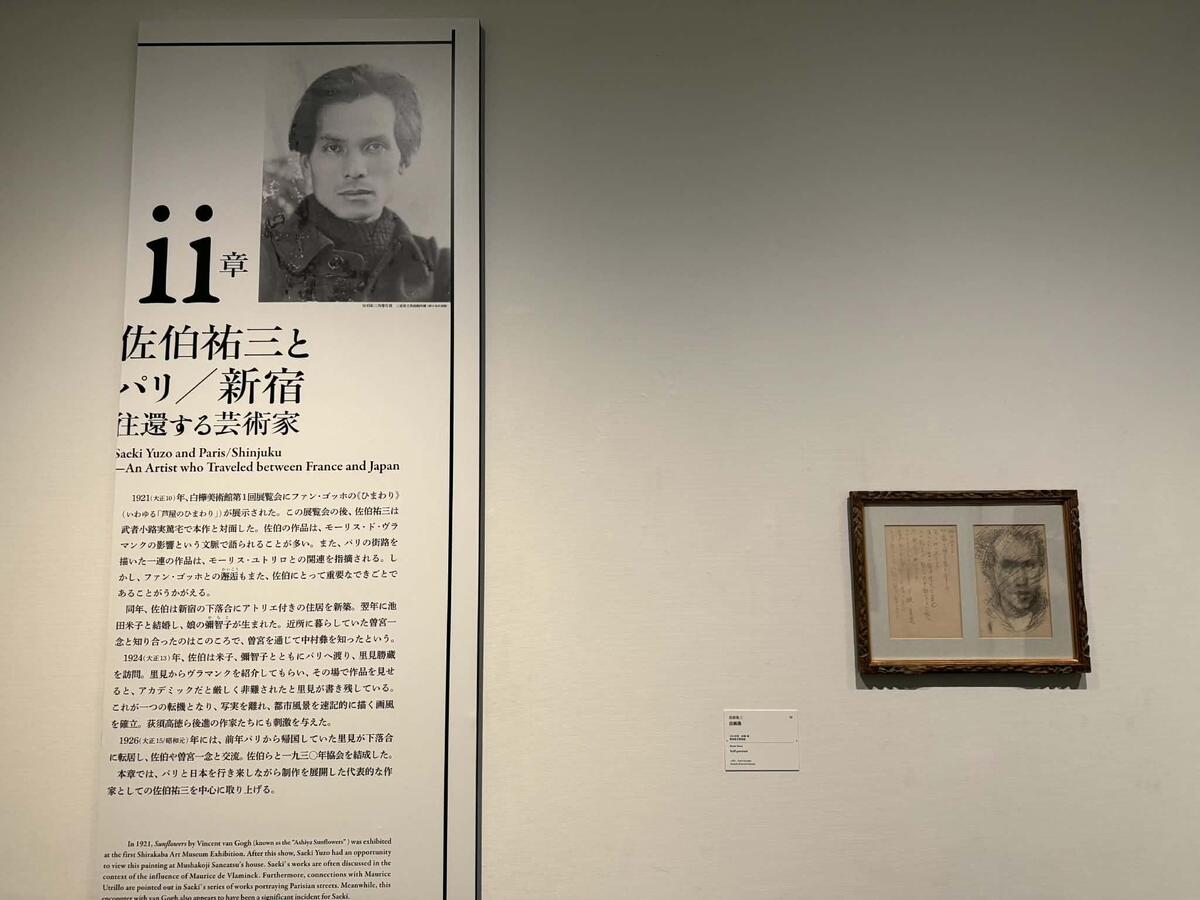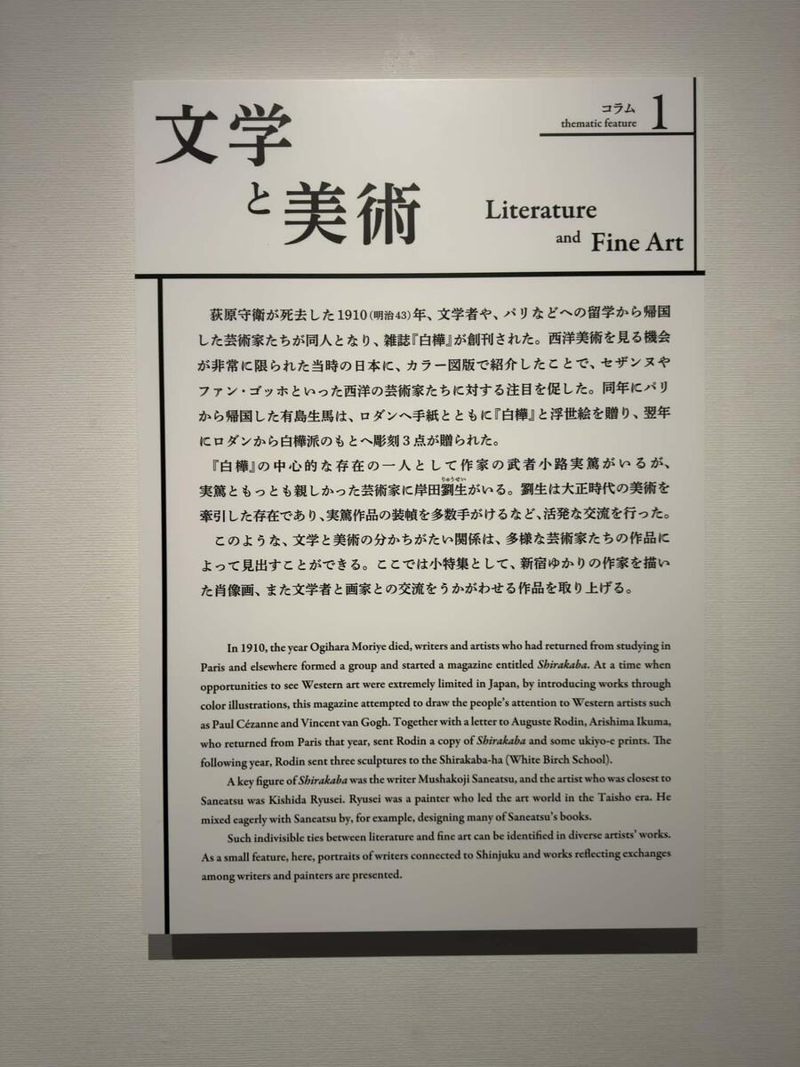 第1章と第2章の間では、「文学と美術」という、切っても切り離せない関係に焦点を当てたコラムが展開される。当時、西洋美術の鑑賞機会が少なかった日本において、カラー図版でセザンヌやファン・ゴッホを紹介し、啓蒙的な役割を果たしたのが1910年創刊の雑誌『白樺』だ。本コーナーでは、その中心人物の一人である武者小路実篤を、盟友・岸田劉生が描いた《武者小路実篤像》を紹介。新宿を舞台に交錯した文学者と画家の深い交流を垣間見ることができる。