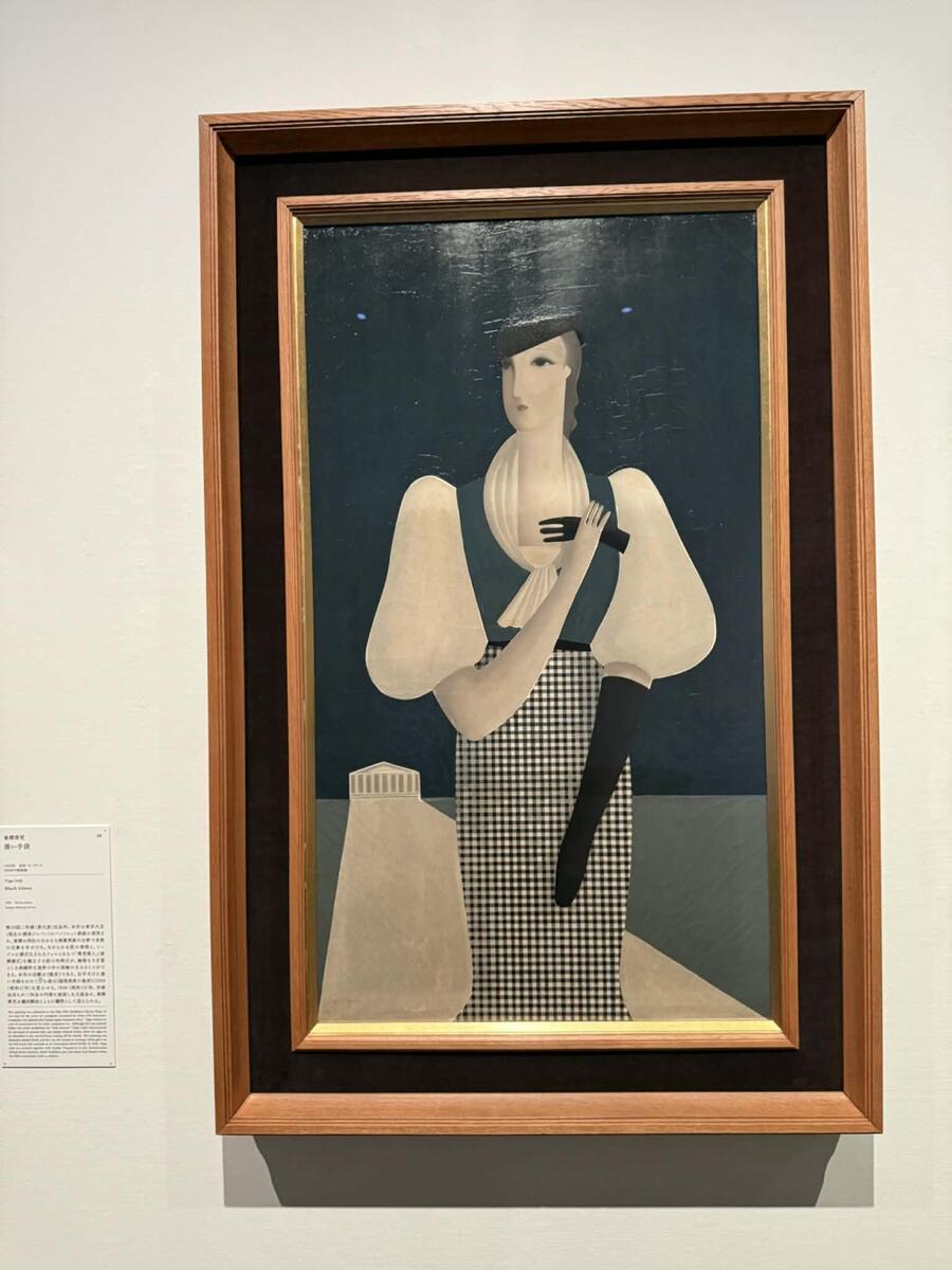 東郷青児《黒い手袋》(1933年、油彩・カンヴァス)。SOMPO美術館所蔵。第20回二科展(第九室)出品作。本作は東京火災(現在の損保ジャパン)のパンフレット表紙に使用され、東郷は同社のほかにも商業美術の分野で多数の仕事を手がけた