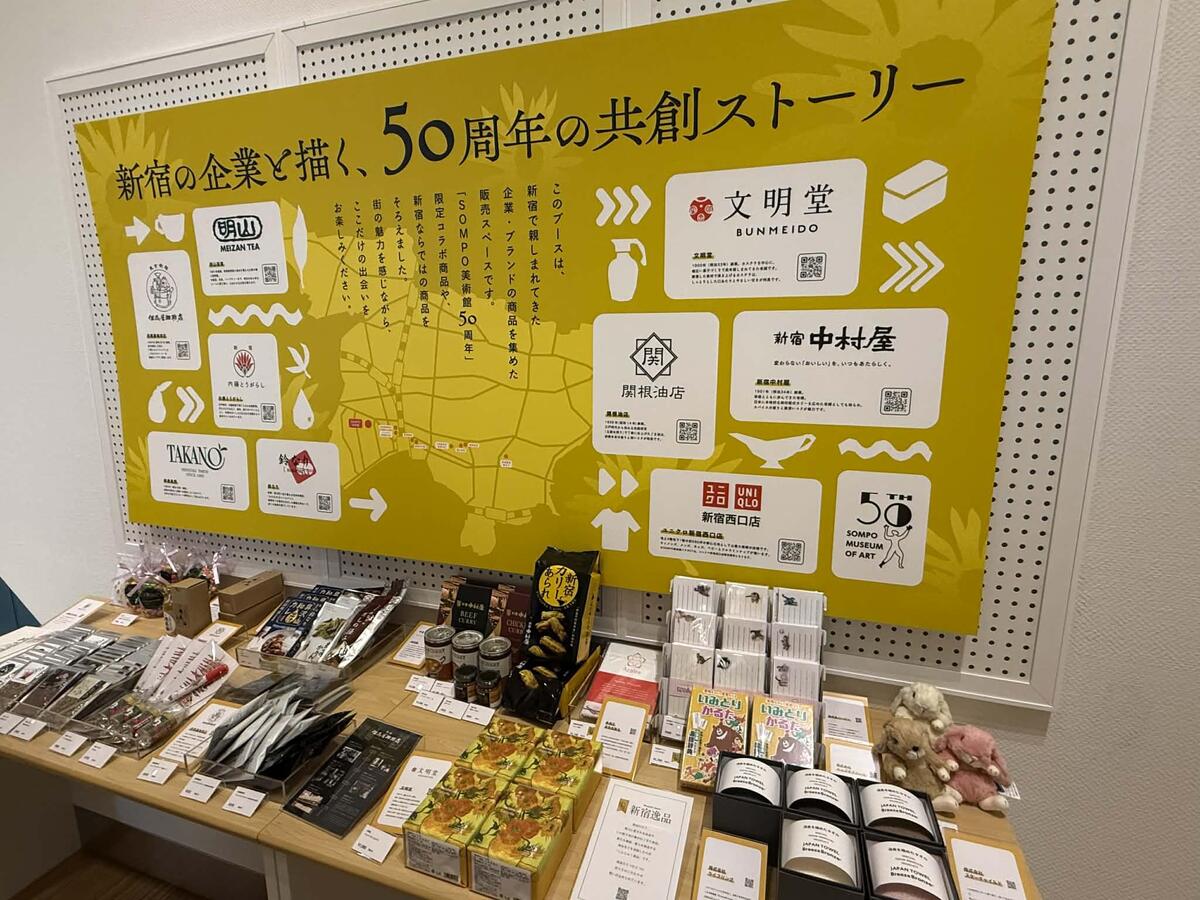 50周年をイメージしたグッズのほかに、地元の新宿ゆかりの企業や店の商品も並ぶ。