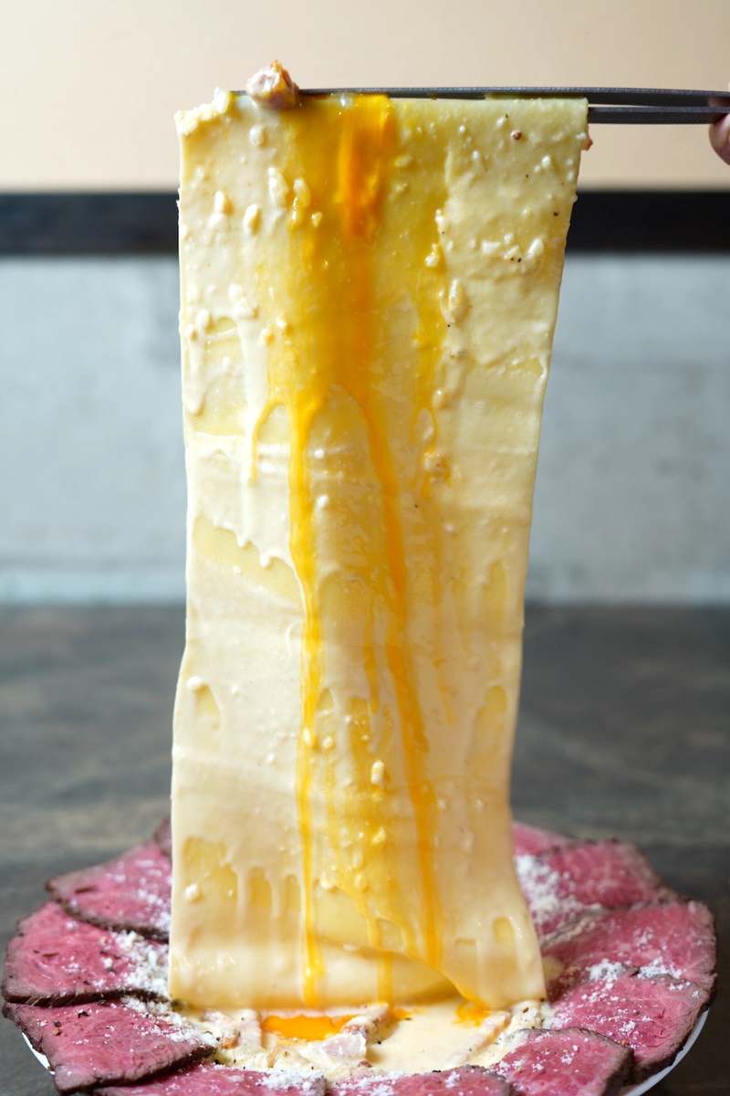 「一枚麺の肉ボナーラ」は、長さ約50cmの特注一枚麺を使用。麺は幅広で生麺なので、もちもちとした食感が楽しめる。専用トングでゆっくりと引き上げると、艶やかなカルボナーラソースが滴り落ち、思わず動画を撮りたくなること間違いなし。北海道産サーロインのローストビーフは柔らかく旨みたっぷりで、そのまま食べてもソースと絡めて食べても◎。
