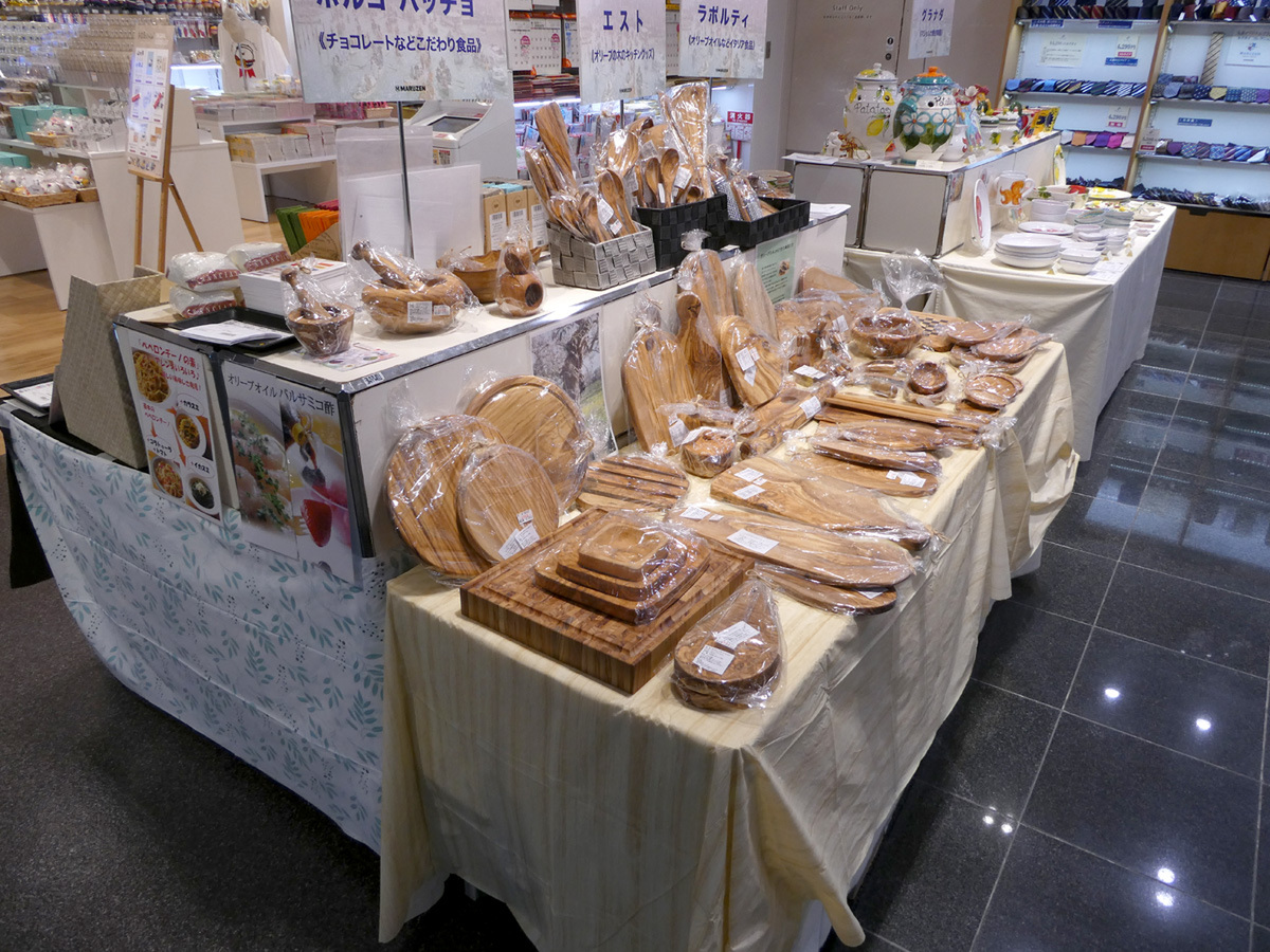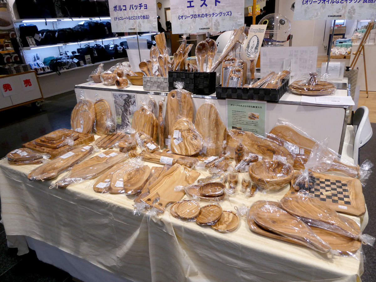 オリーブの木で作られたキッチングッズ。イタリアではオリーブの木の伐採は樹齢800年を超えた木しかできないため、木目の詰まった木材となっている。通常の木工製品に比べてずしっとした重み、堅さがあるのが特徴